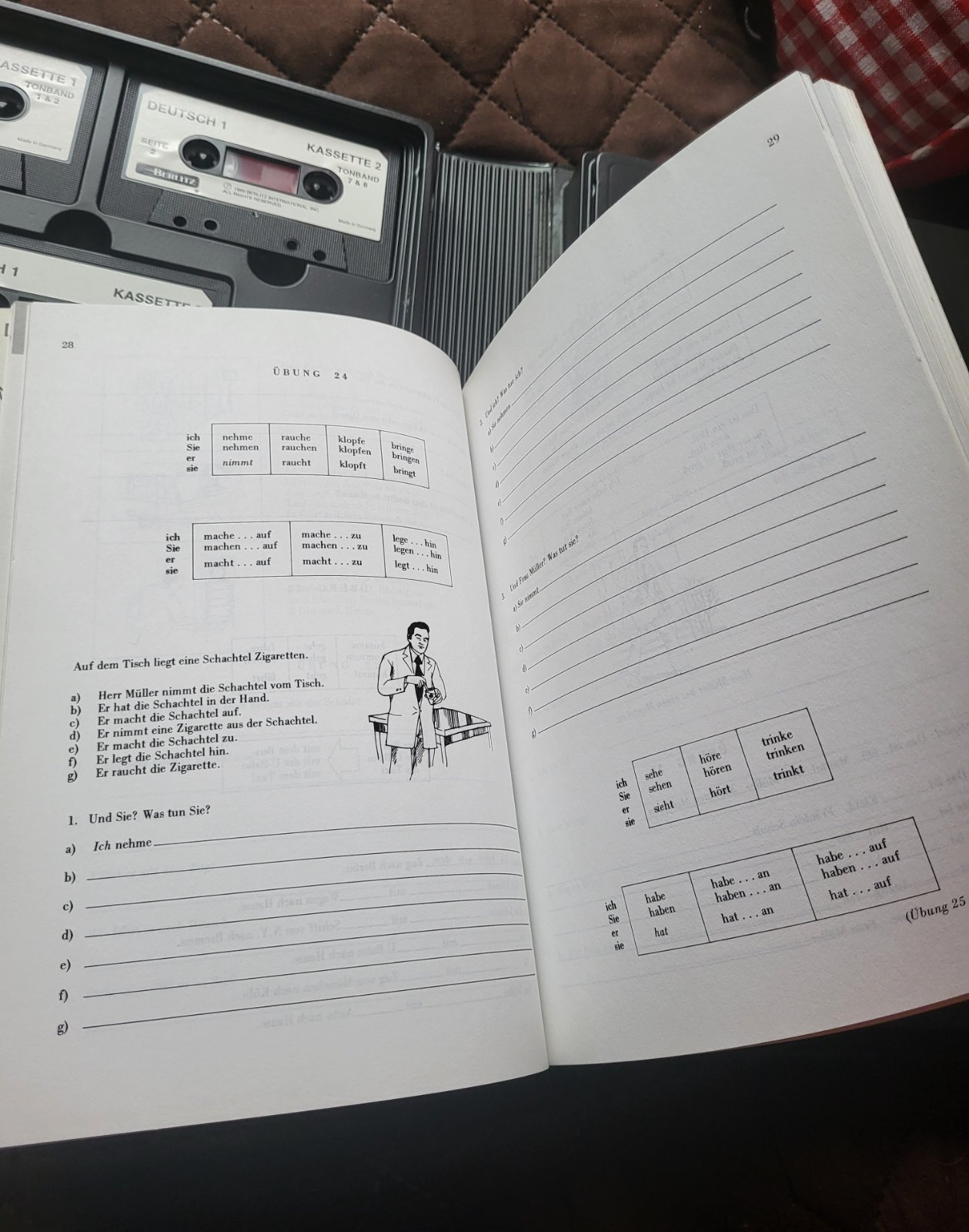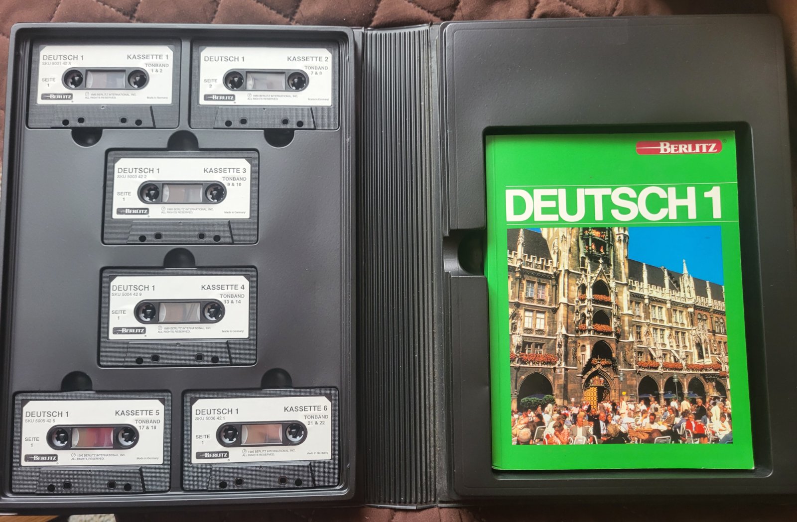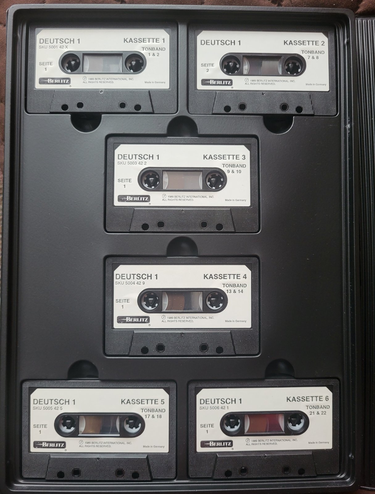 veľmi dobrý stav, bez poškodenia, kazety plne funkčné, je to kompletná sada klasického jazykového kurzu Berlitz Deutsch 1. Ide o retro učebný materiál určený pre začiatočníkov, ktorý bol populárny najmä v 80. a 90. rokoch.
