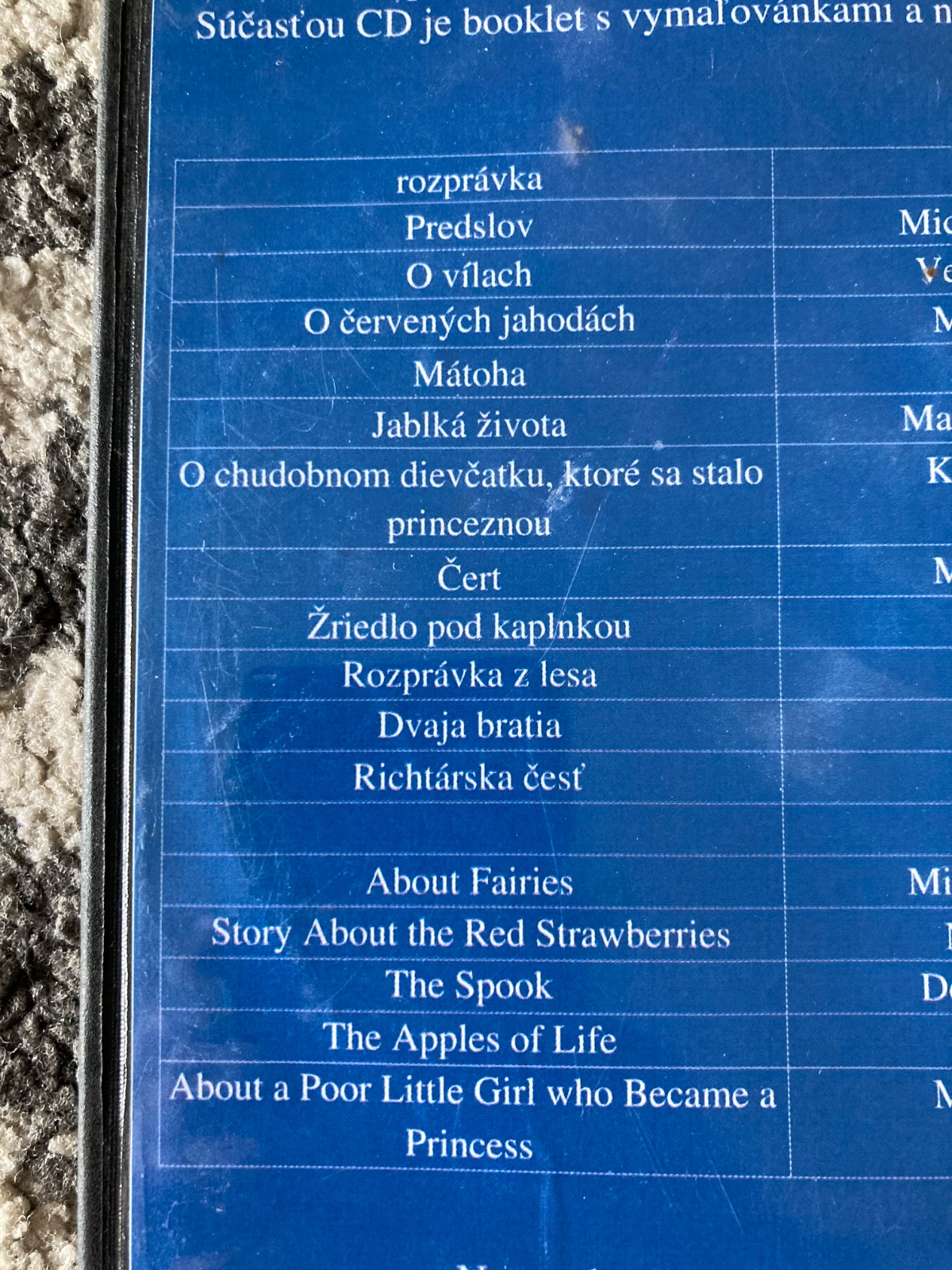 📌Obsah: CD obsahuje rozprávky, ktoré sú k dispozícii v anglickom aj slovenskom jazyku (napr. od autorov H. Ch. Andersena, bratov Grimmovcov či Ch. Perraulta).