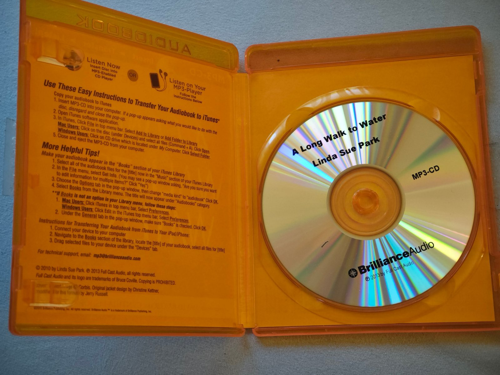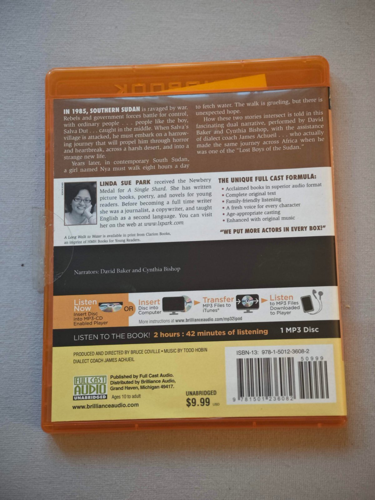 Anglická audiokniha A Long Walk to Water od autorky Linda Sue Park, MP3-CD na 2:42 hodiny počúvania, privezené z USA, pôvodná cena 9,99 dolárov, nové. Podľa skutočného príbehu, vhodné pre deti od 8 rokov a dospelých. Výborné aj na výuku angličtiny. Pozri ďalšie ponuky, viac kusov zľava 10-30%. Po zaplatení ceny a poštovného na účet posielam aj poštou.
