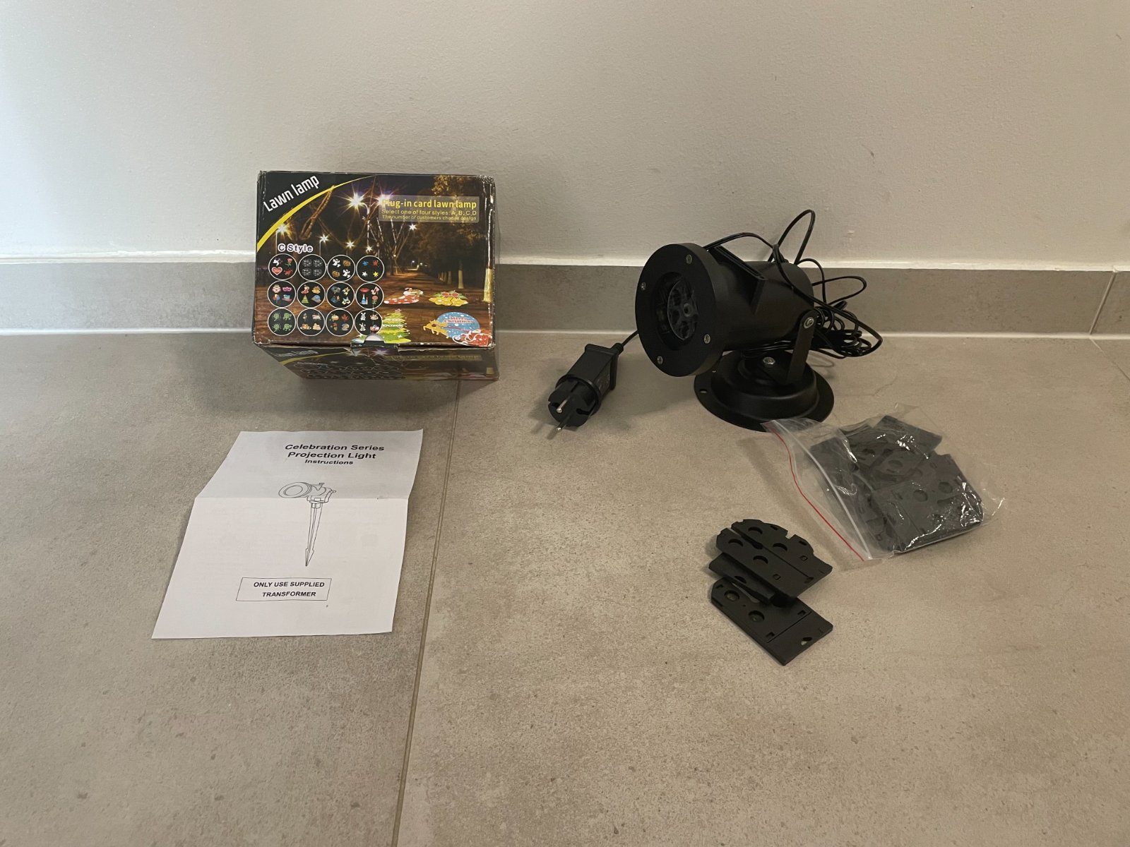 predám paradnu projekciu na stenu pouzitu 1x je vhodna pre interier tak pre exterier pridavam 12ks roznych motivov vid.krabica, predávam komplet prislusenstvo jediny rozdiel je že ja mam so stojanom a na navode je vyobrazeny hrot na zapichnutie do zeme.