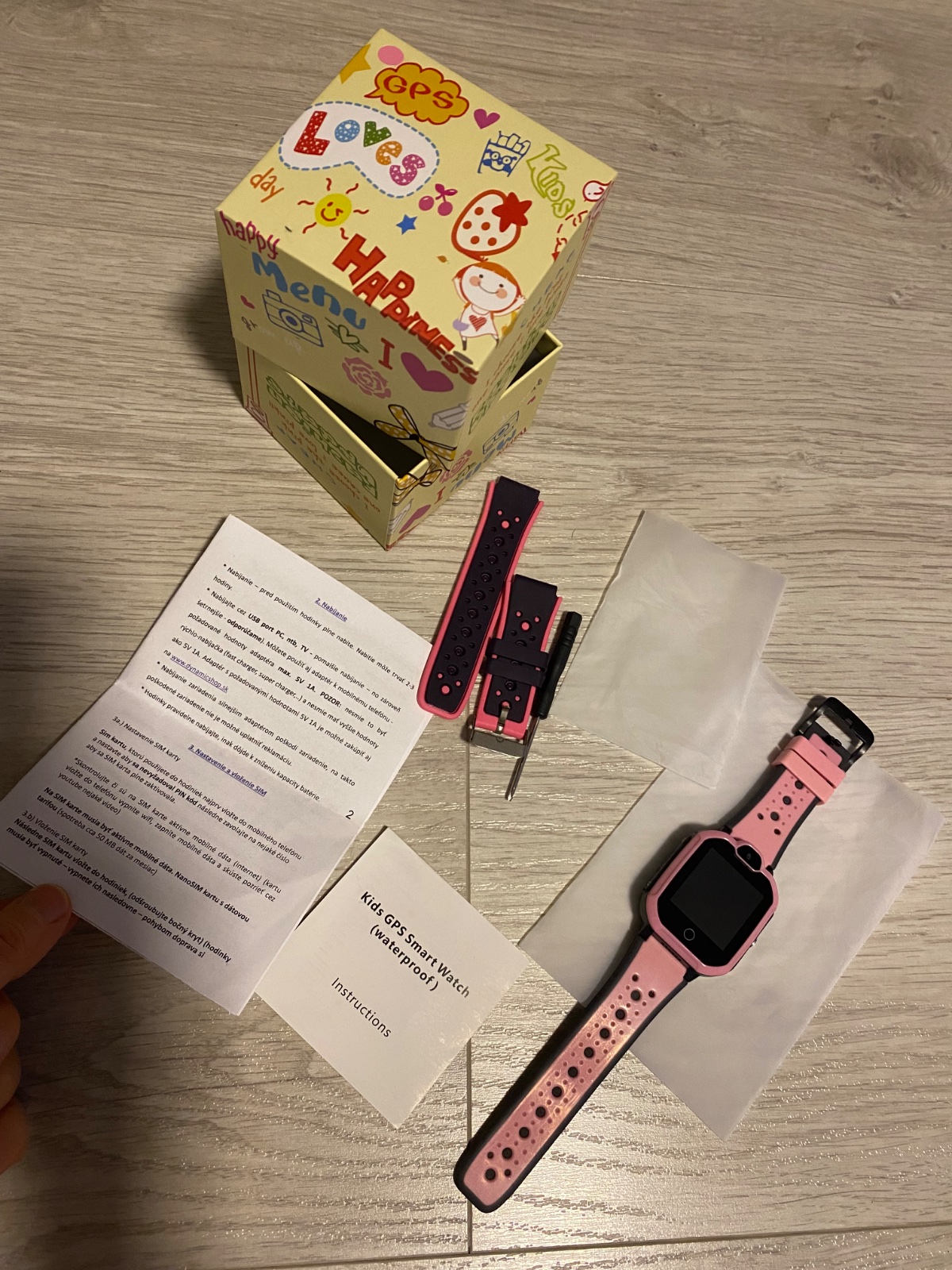 Hodinky boli velmi malo nosene, dieta potom dostalo mobil. Je k tomu nabijaci kabel a nahradny remienok.