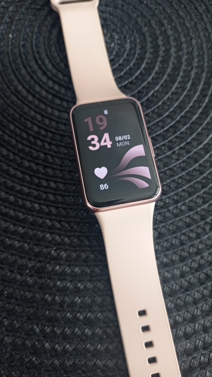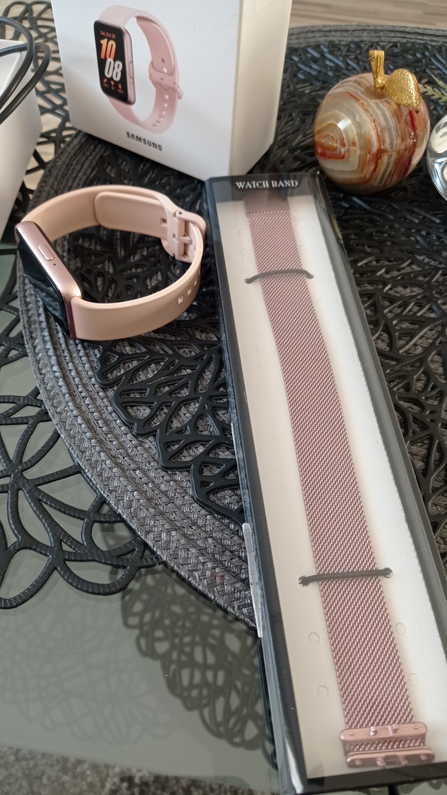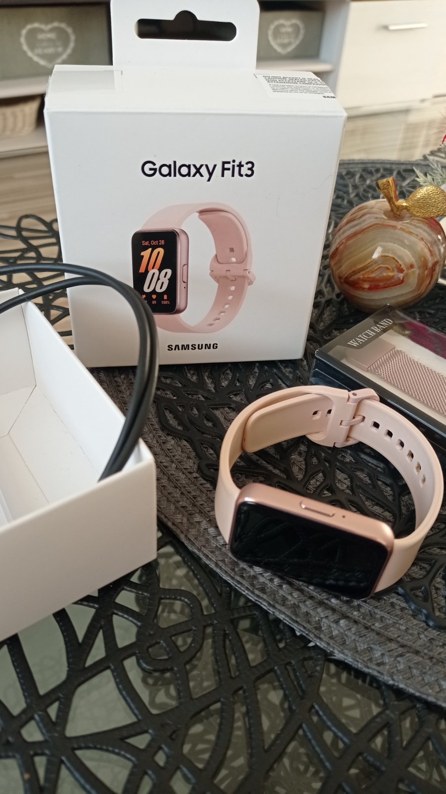 Predám krásne fit hodinky Samsung Galaxy Fit 3, farba Pink gold, v top stave, všetko funkčné, malý skrabancek na displeji ktorý sa mi ani nepodarilo odfotiť (zohľadnené v cene), na funkčnosti nijako neovplyvňuje, nosené minimálne, nabité na 100%, treba si iba nastaviť dátum čas a spárovanie s telefónom a môžete používať, majú milión funkcií
