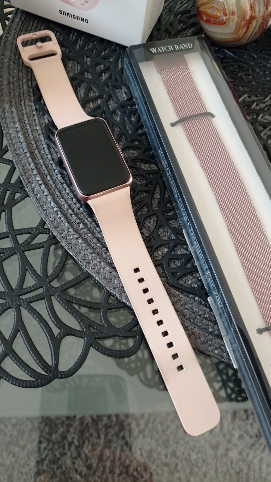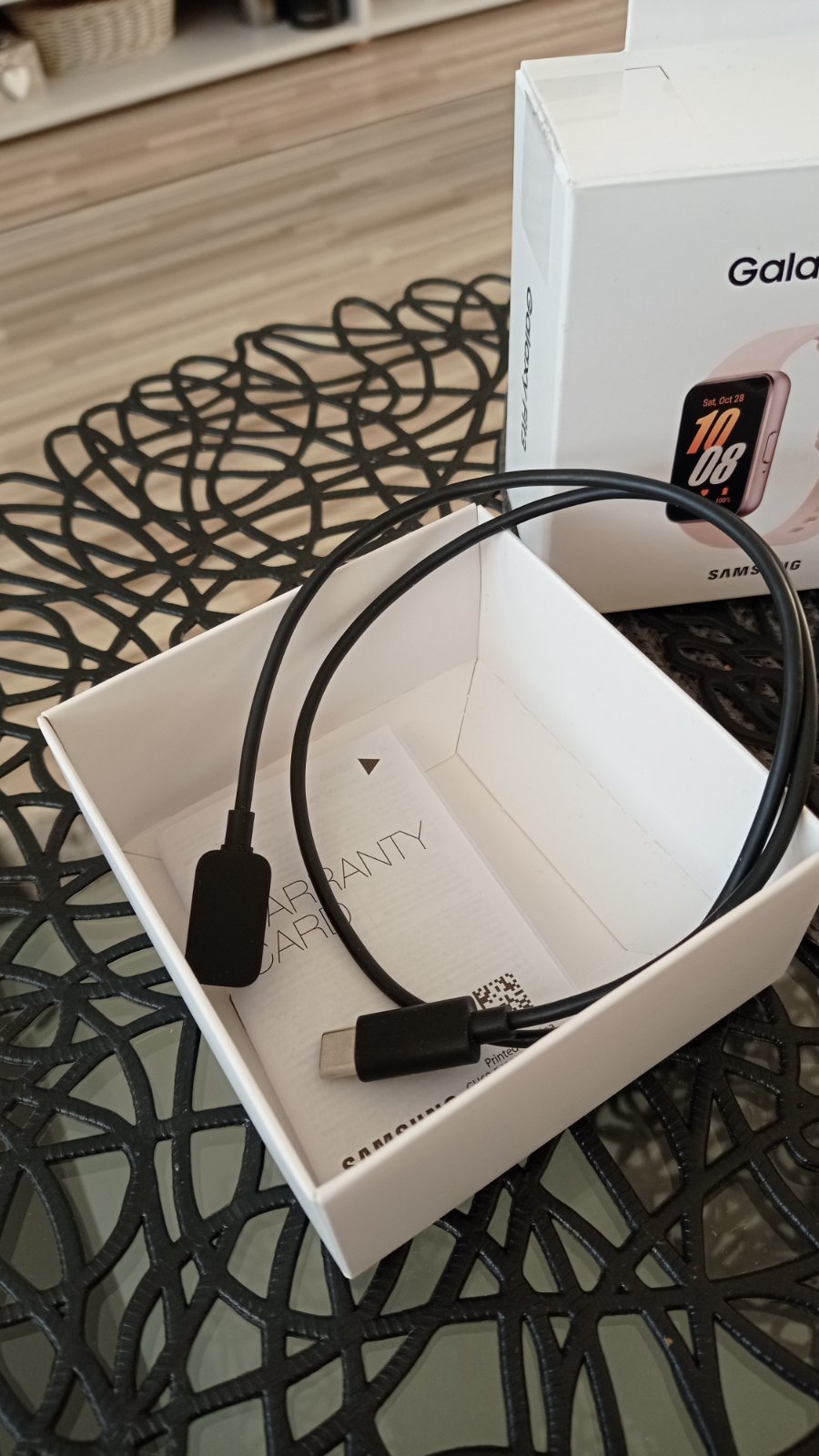 Komplet balenie v krabičke, návod, nabíjačka + nový remienok presne k týmto hodinkám, nikdy nenoseny (cena iba remienka bola 17€).
