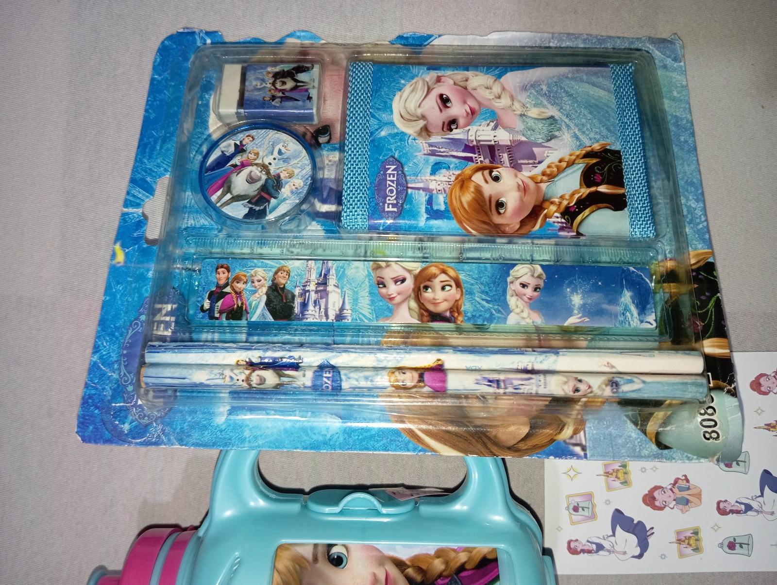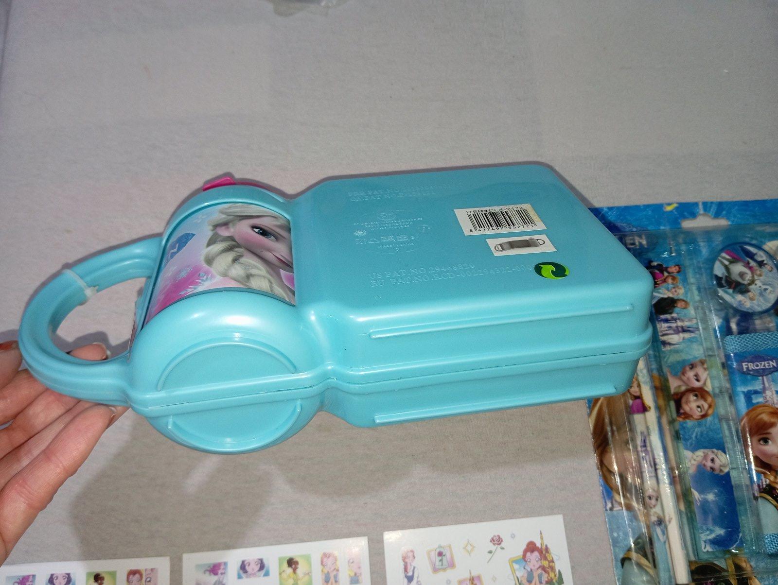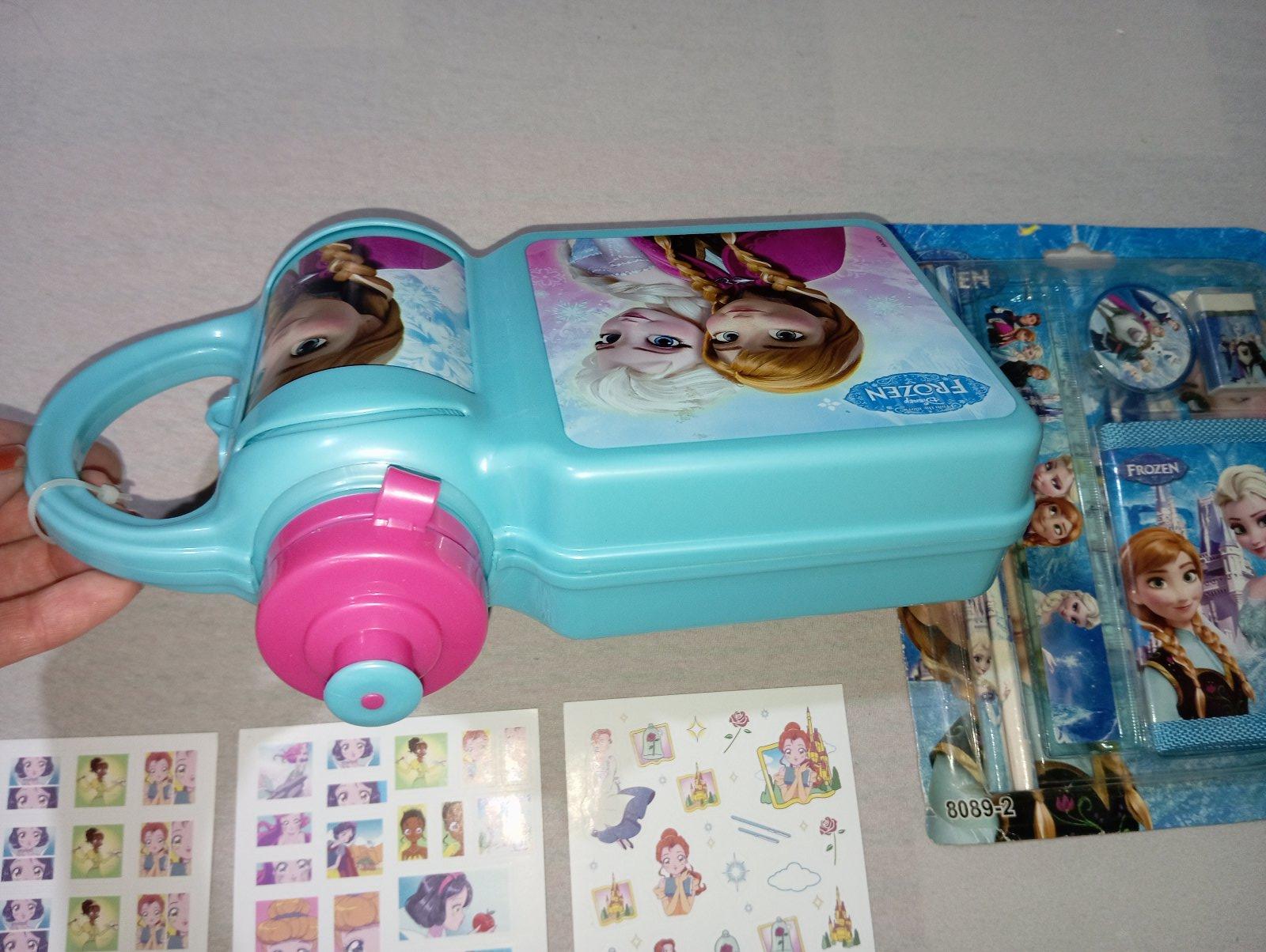 Desiatový box Frozen Ľadové kráľovstvo s fľaškou. Je to stále zaistené plastovou páskou, nikdy to nebolo používané. Nedá sa mi to otvoriť a odfotiť vnútro. Pri fľaške je klipsa, s korou sa to otvára sprava doľava, ako kniha. Fľaška sa dá dač preč a používať ju samostatne.