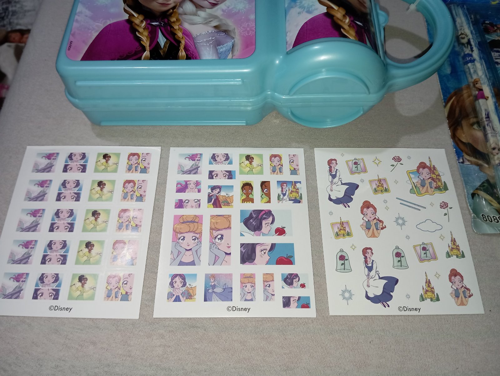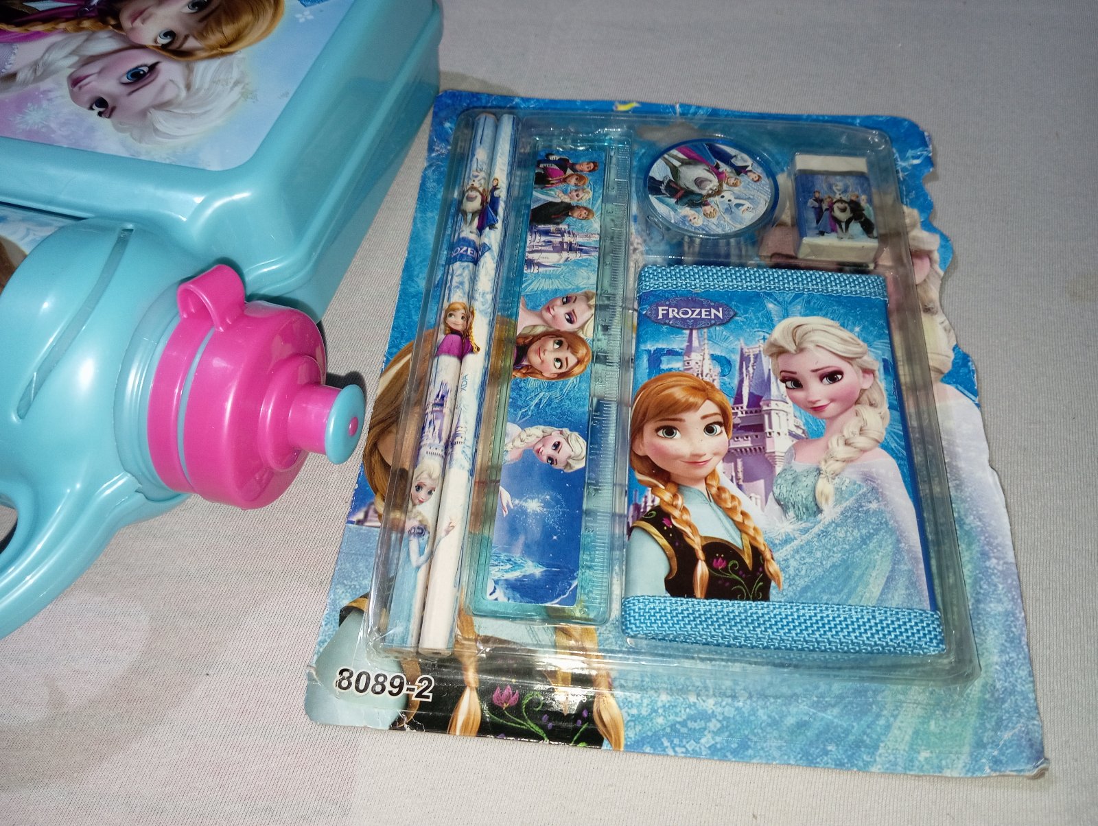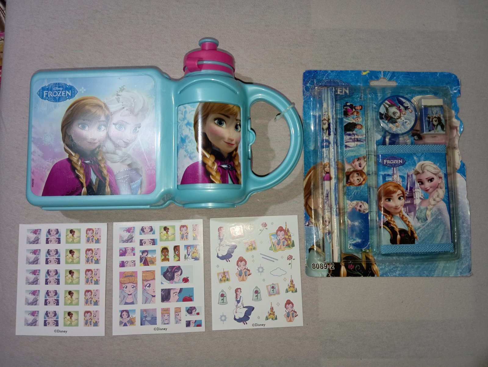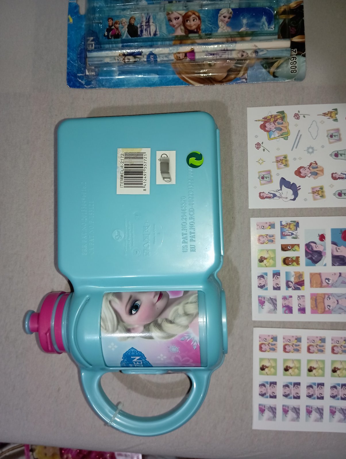 Desiatový box Frozen Ľadové kráľovstvo s fľaškou. Je to stále zaistené plastovou páskou, nikdy to nebolo používané. Nedá sa mi to otvoriť a odfotiť vnútro. Pri fľaške je klipsa, s korou sa to otvára sprava doľava, ako kniha. Fľaška sa dá dač preč a používať ju samostatne.