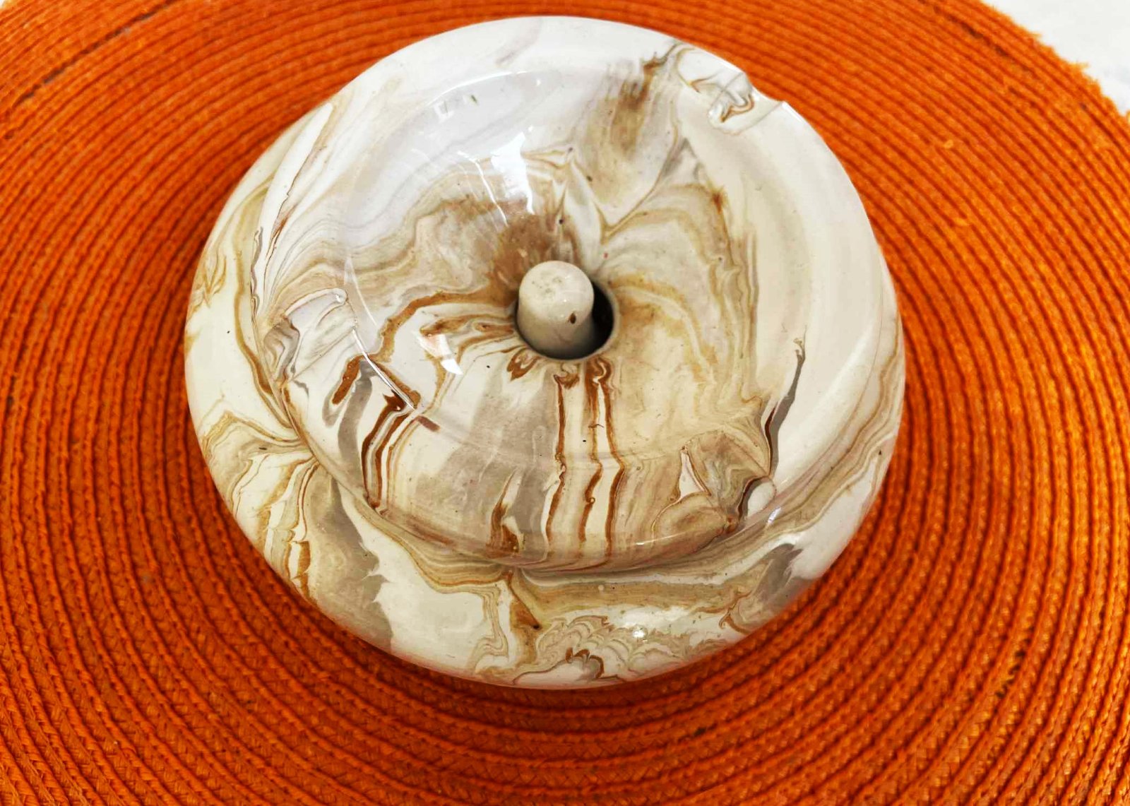 praktický keramický popolník,ktorý tým,že má príklop,zahasí ohorky a ostáva uzavretý,výška = 6 cm, vrchný priemer = 10 cm, v strede širší a dolu sa zúžuje na priemer = 10 cm,nesmrdí a je bezpečný