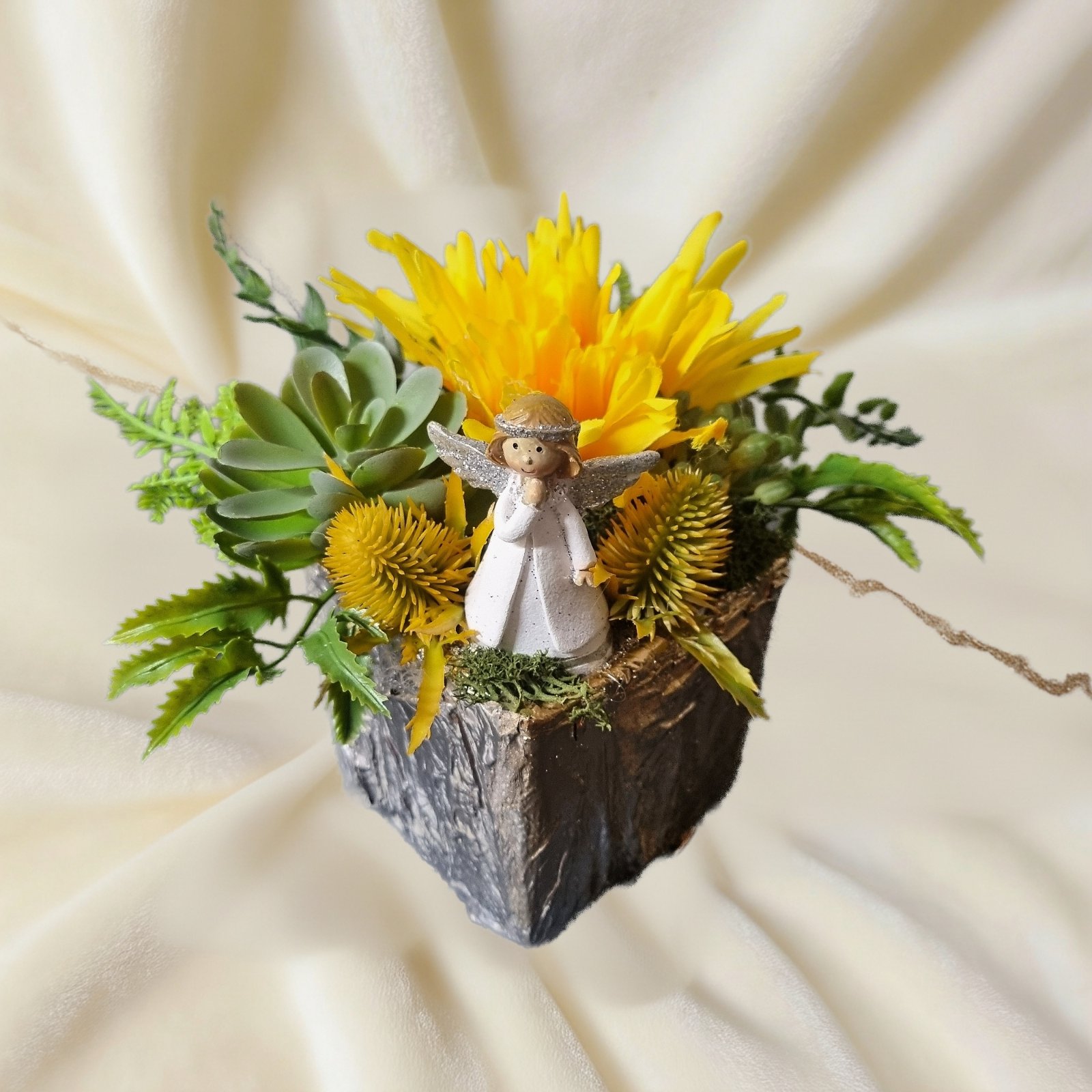 Menší aranžmánik / ikebanka, aj na urnový hrobček v sklenenej nádobke z vypálenej sviečky, žltým kvetom a bielym anjelikom - dekorácia