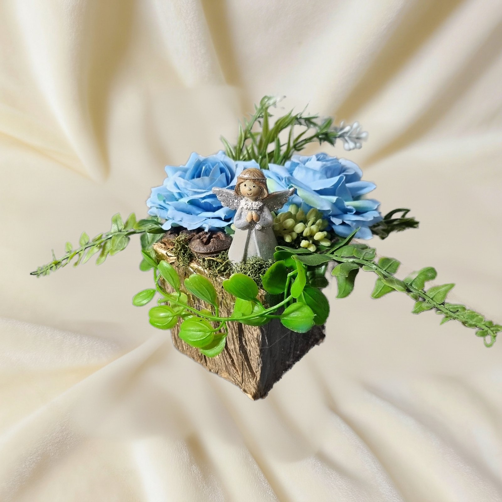 Menší aranžmánik / ikebanka, aj na urnový hrobček v sklenenej nádobke z vypálenej sviečky, modrými ružičkami a hlineným anjelikom - dekorácia