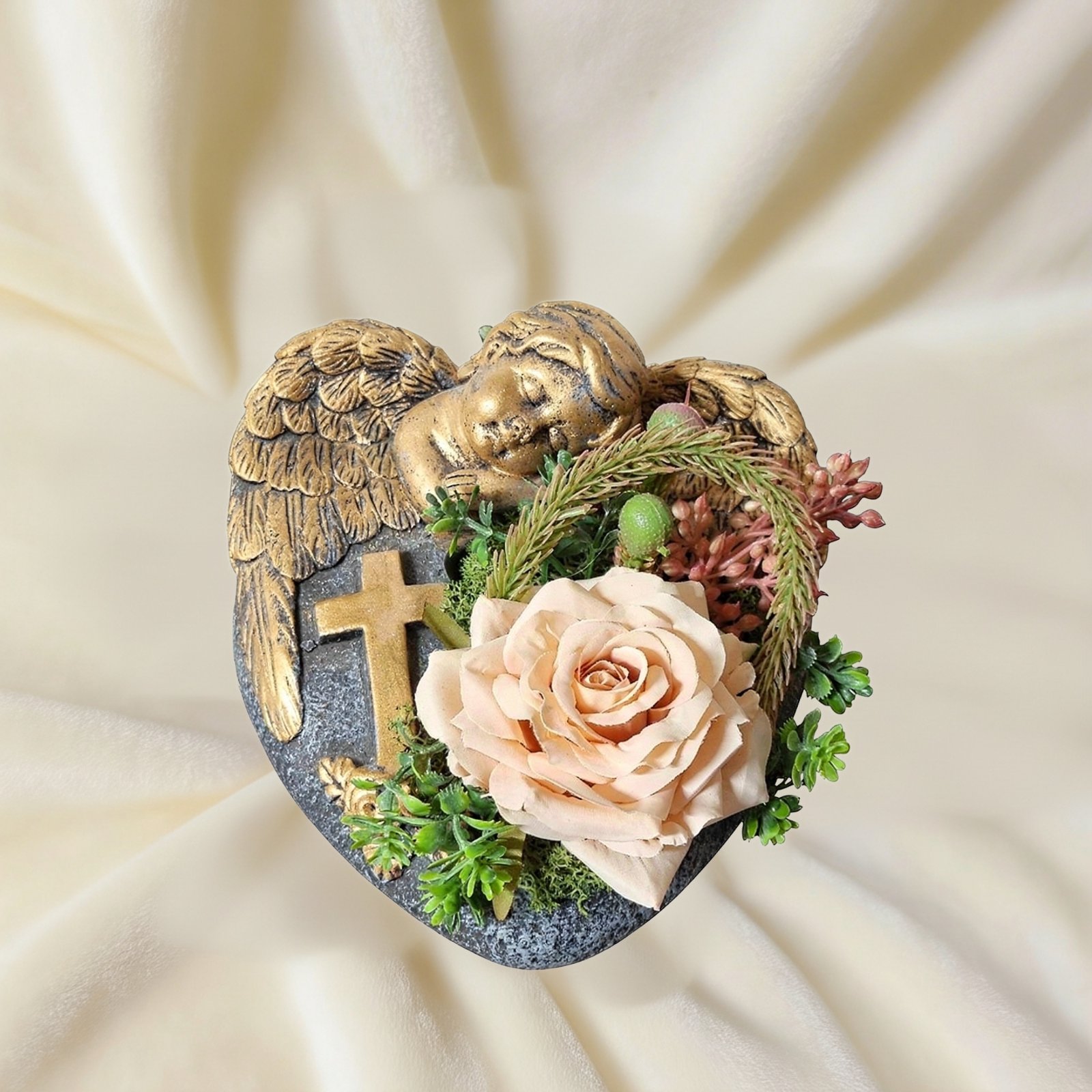 Celoročná menšia zaťažená ikebana, aj na urnový hrobček, v cementovom srdiečku so zlatým anjelikom - dekorácia