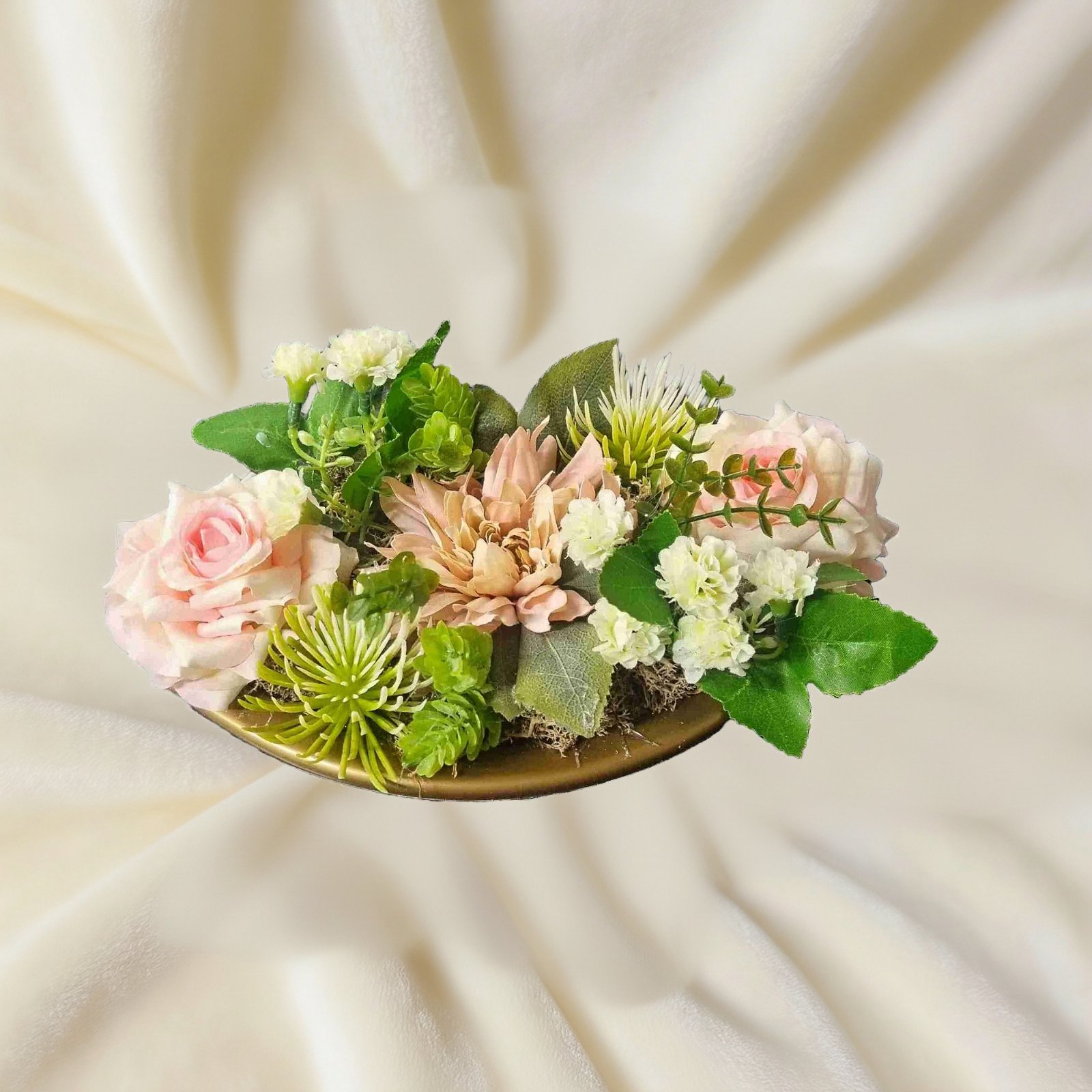 Dušičky - celoročná zaťažená ikebana na hrobček v plastovej miske zlatej farby, s bledoružovými kvetmi, drobnými bielymi kvietkami a zeleňou - dekorácia