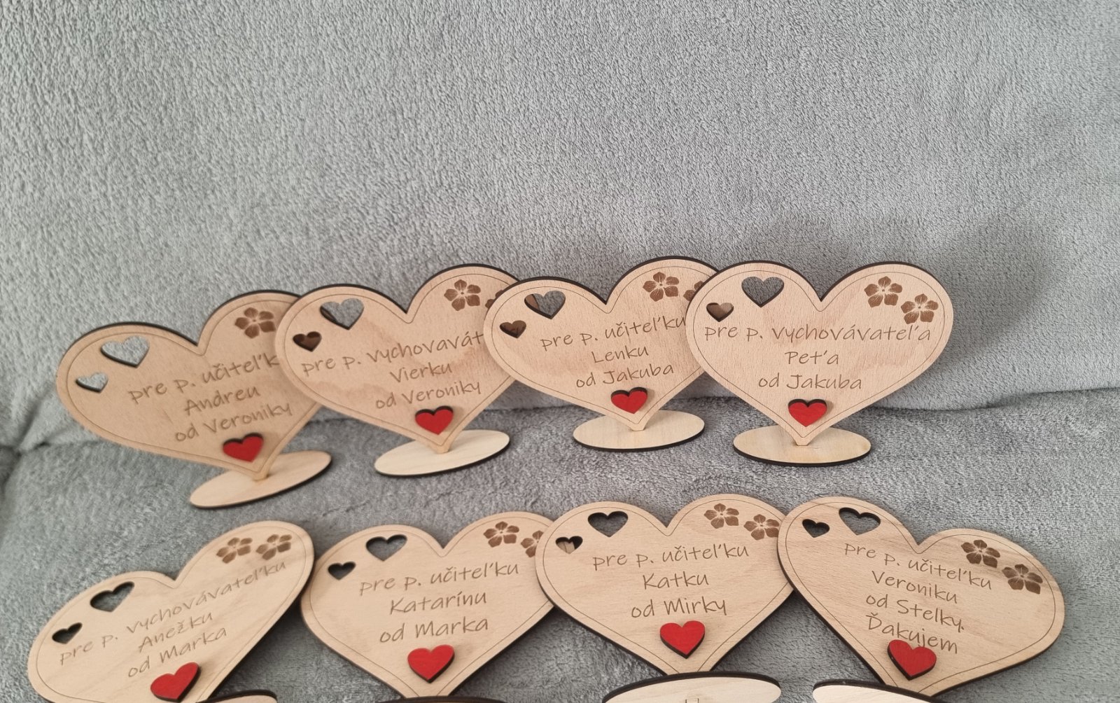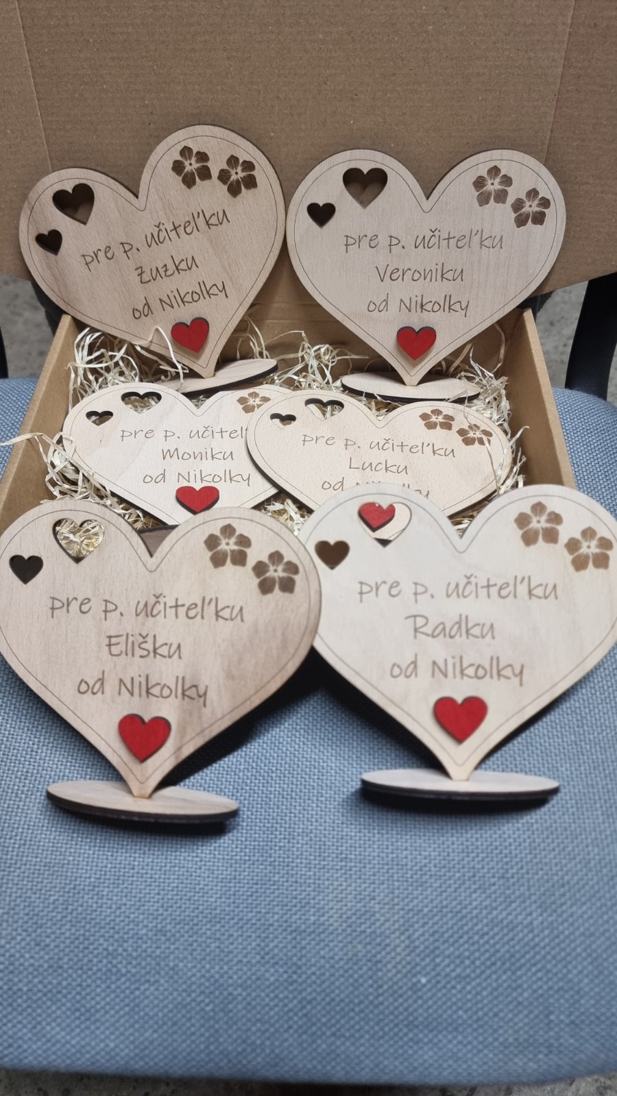 Drevené drobnosti pre pani učiteľky, asistentky, kuchárky... na koniec školskeho roka. Kvietky ktoré nikdy nezvadnu, srdiečka s textom podľa želania. Ceny od 2-6€. Vieme vyrobiť aj magnetky či kľúčenky, mydielka. Pre viac info poprosím správu