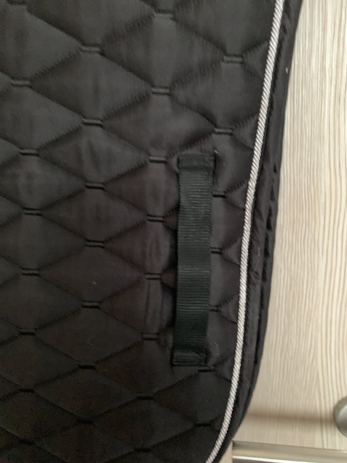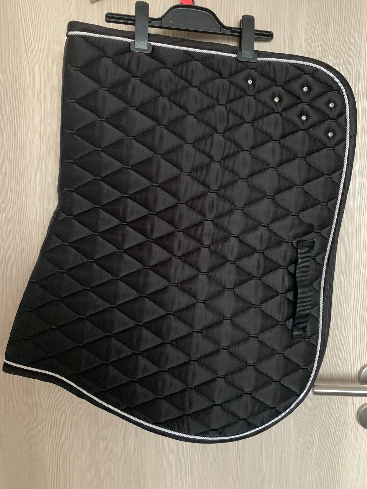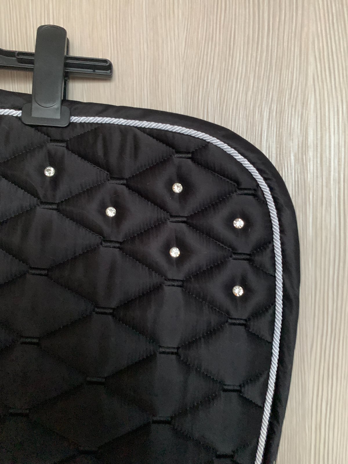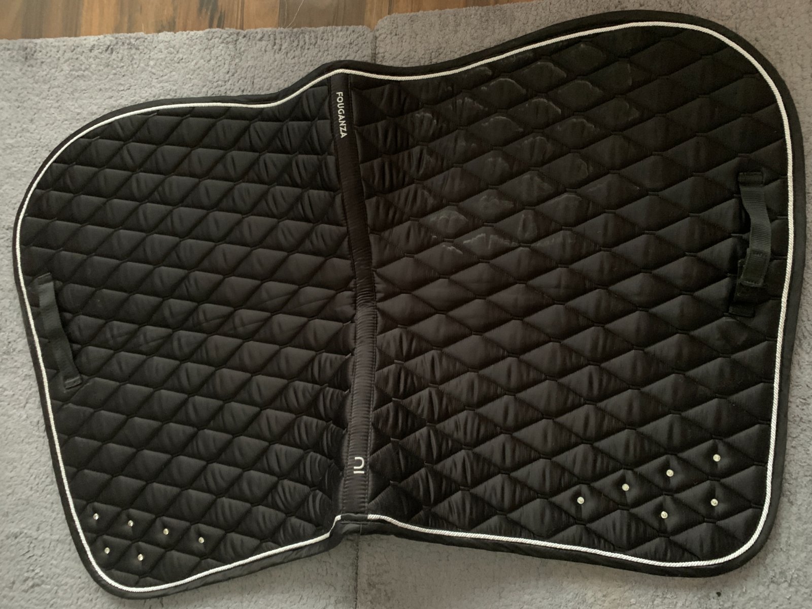 Podsedlovka pre kone a poníky 500 štrasová čierna, vnútri je materiál zo sieťoviny, ktorý dobre odvádza pot, hrubá vrstva mäkkej výplne z vaty je tvarovaná na chrbát koňa, dve pútka na podbrušník sú umiestnené na obidvoch stranách podsedlovky.