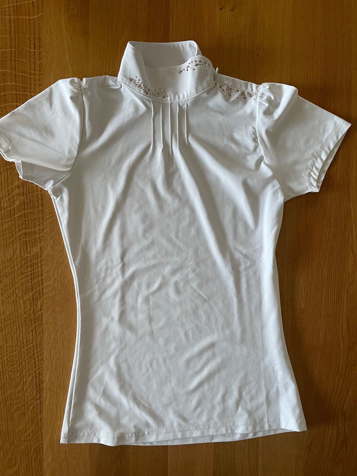 Krásne biele jazdecké tričko na preteky so zapínaním na pleci (zips + patent) s vkusnými dekoračnými kryštálmi. Tričko bolo párkrát oblečené na pretekoch, je v 100% stave bez akéhokoľvek poškodenia.