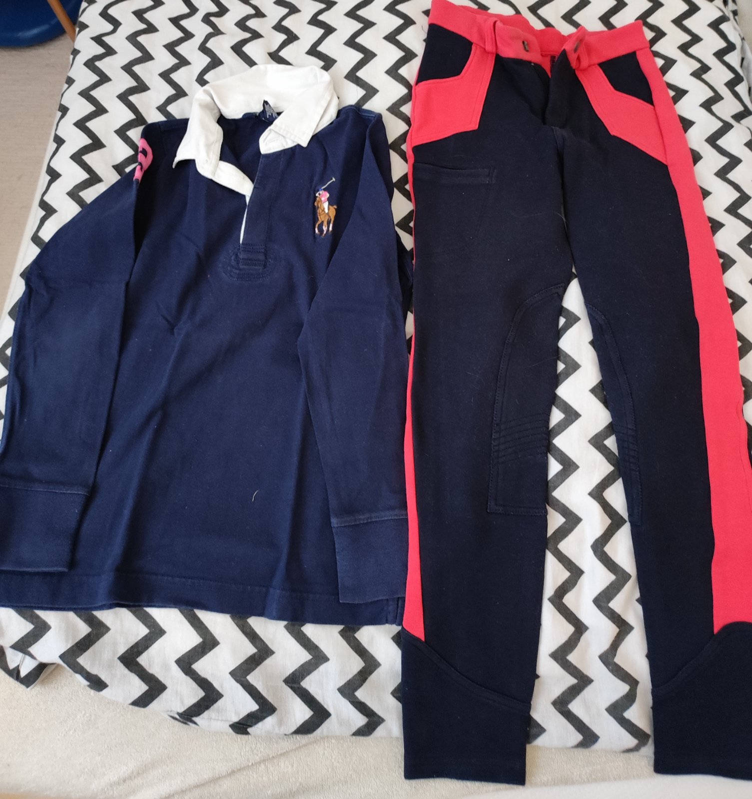 Predám súpravu oblečenia na jazdenie na koni.Jazdecke nohavice zn fouganza+ Polo tričko z dlhým rukávom....nohavice prešívané ,po bokoch lososový lem...spevnený sed aj stehná...príjemný mäkký materiál ,kvalitné v super stave....tričko bavlnené nosené ale v dobrom stave ..P.C len nohavíc bola 80€