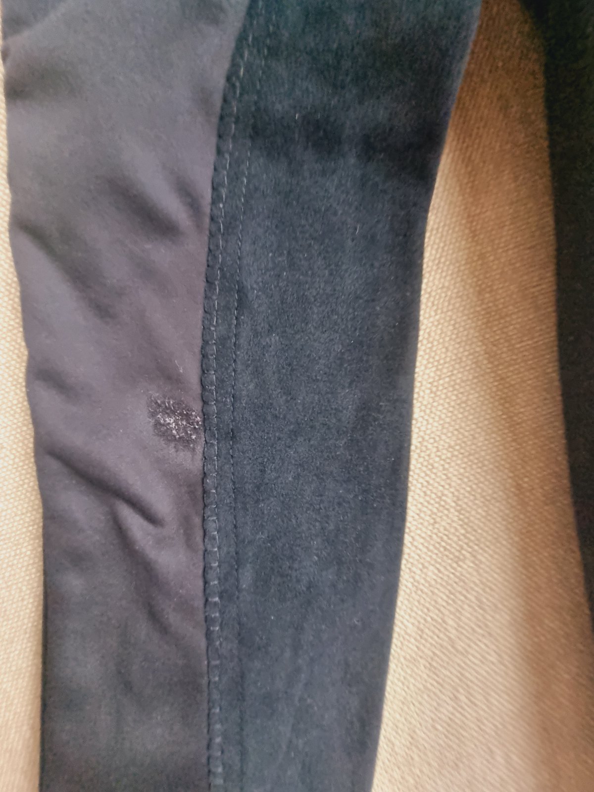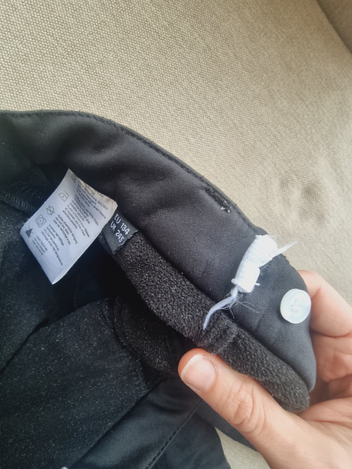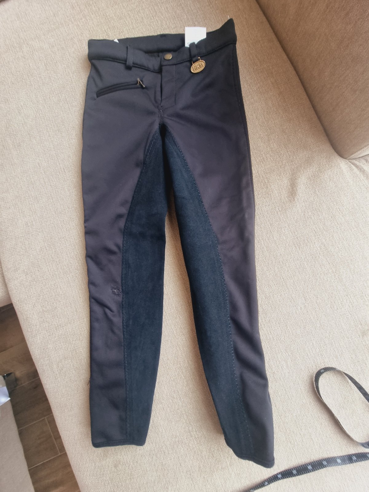 Na kolienku je osuchnute, znacka HKM. V pase stahovanie patent gumka-gombik