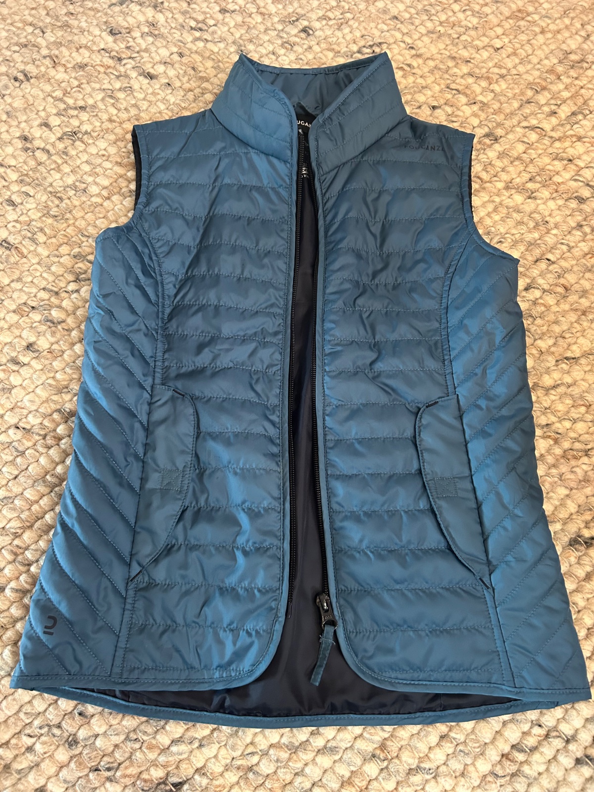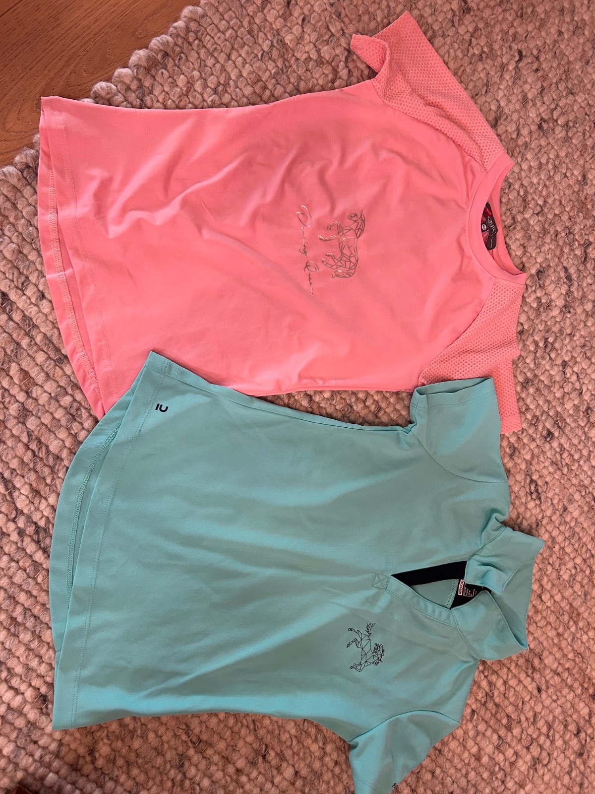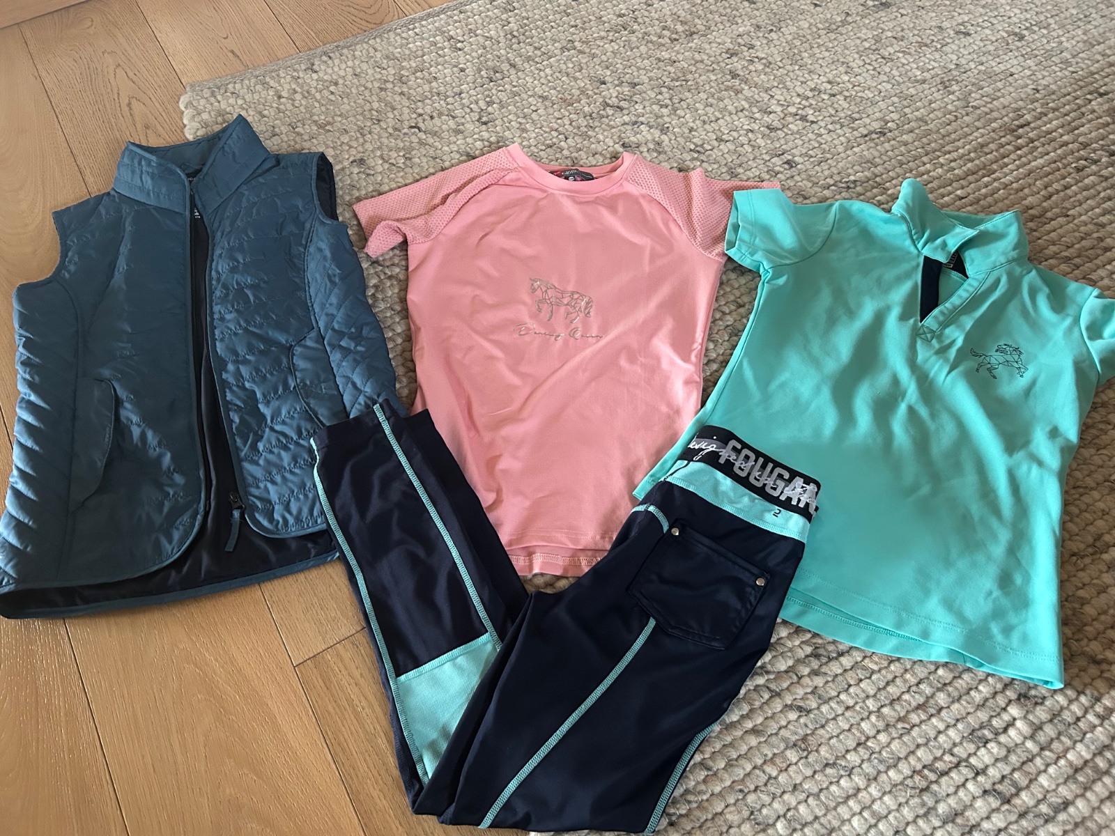 Ponúkame set po dcérke, ktorá rekreačne chodila na hodiny jazdenia. Oblečenie je veľmi zachovalé, bez poškodenia alebo známok nosenia. Nohavice, vesta a modré tričko sú z Decathlonu - veľkosť 133-142. Bledoružové tričko je z jazdeckého obchodu, nebolo oblečené ani raz.