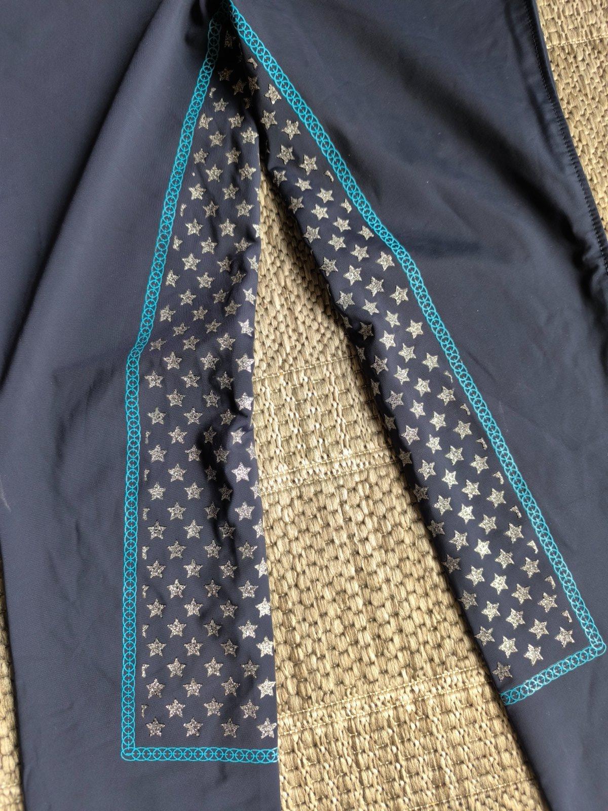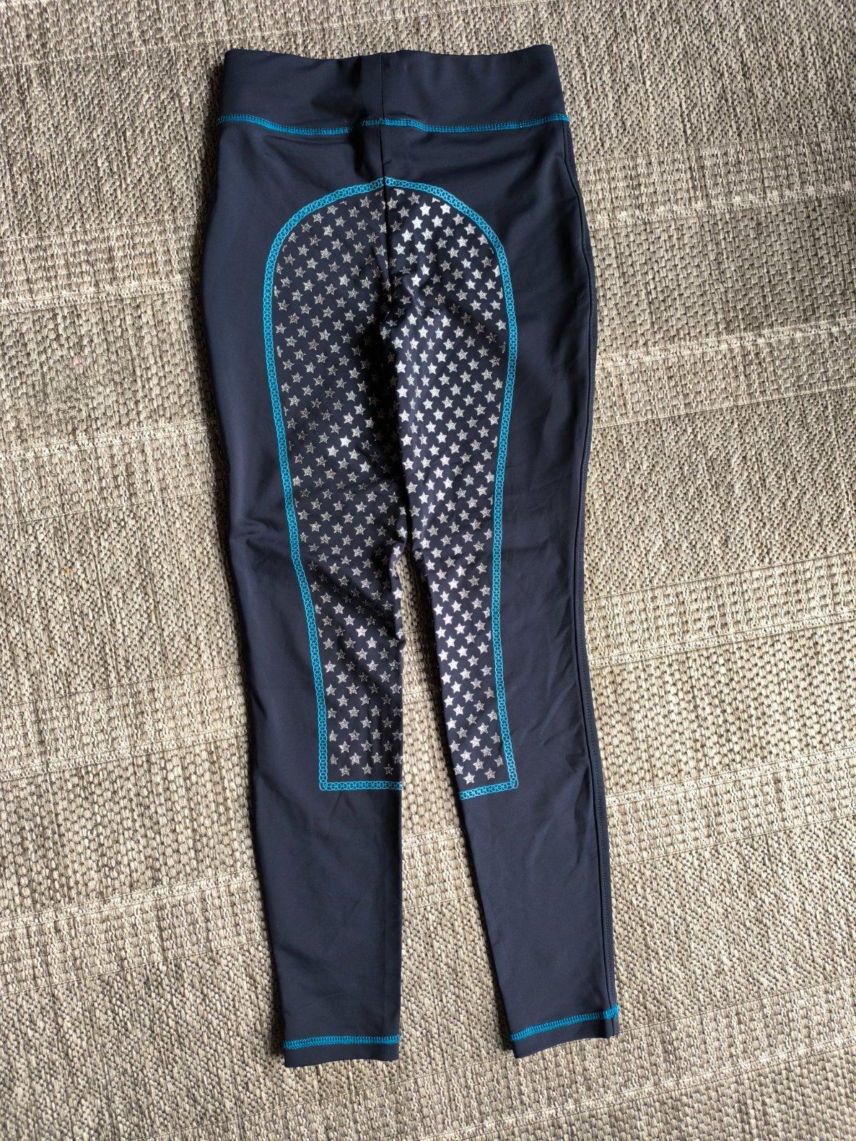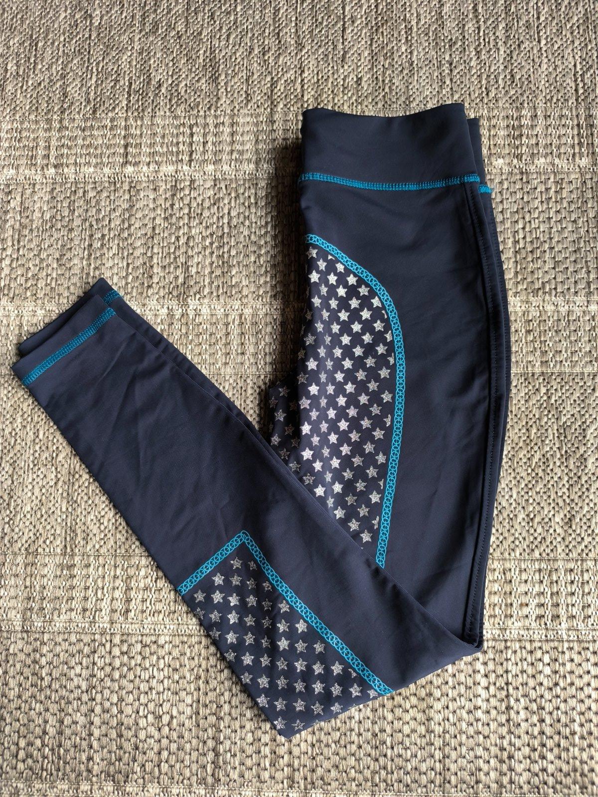 Nohavice, legíny na jazdectvo. Silikónové časti v oblasti zadku a vnútorných strán nôh zaručujú dobrú priľnavosť v sedle. Legíny sú elastické, dobre priliehajú a nevyhŕňajú sa z jazdeckých čižiem. Veľkosť 164. Dĺžka 93cm, šírka v páse 32cm, pás je elastický a natiahne sa až na 39cm.