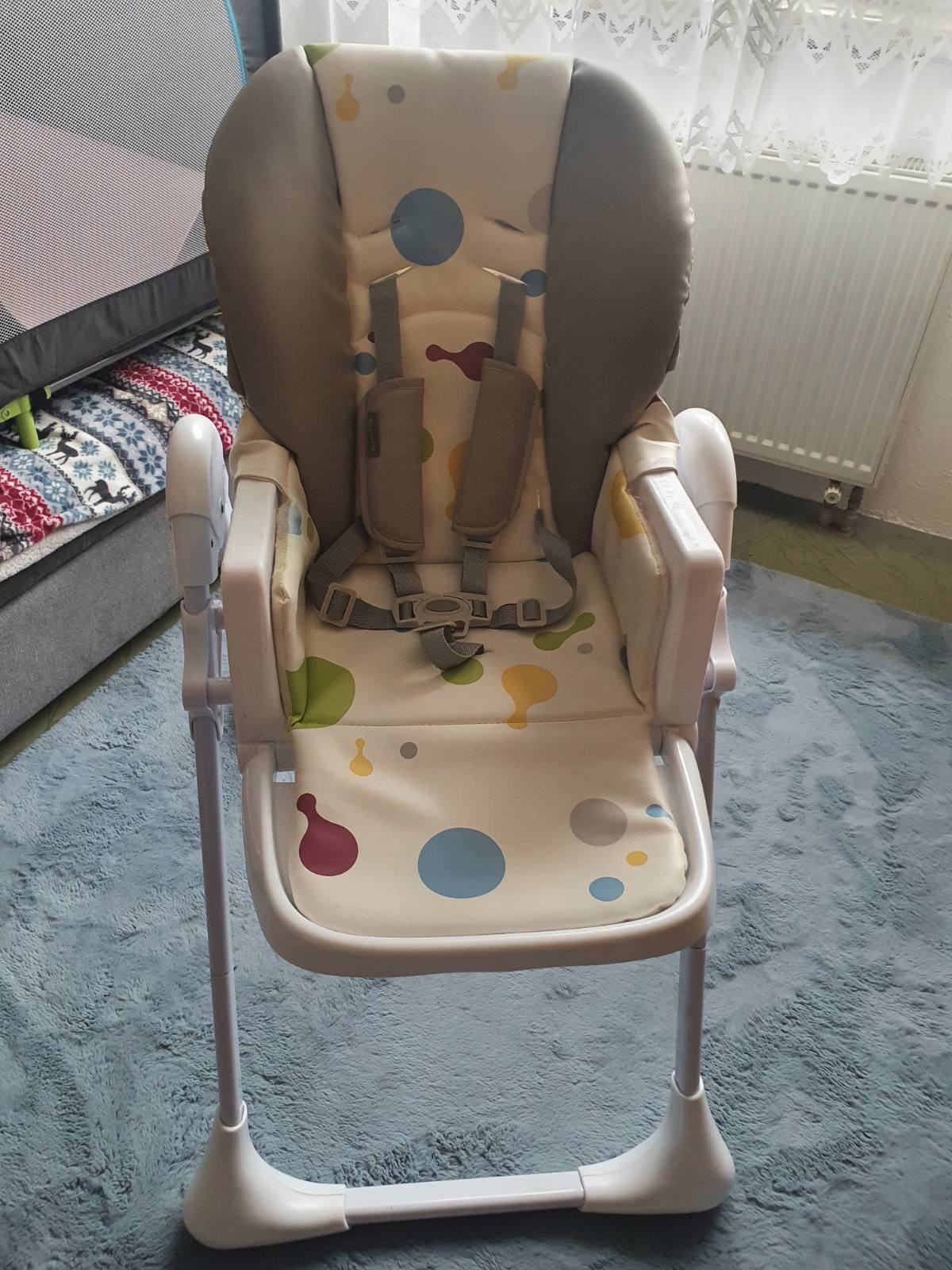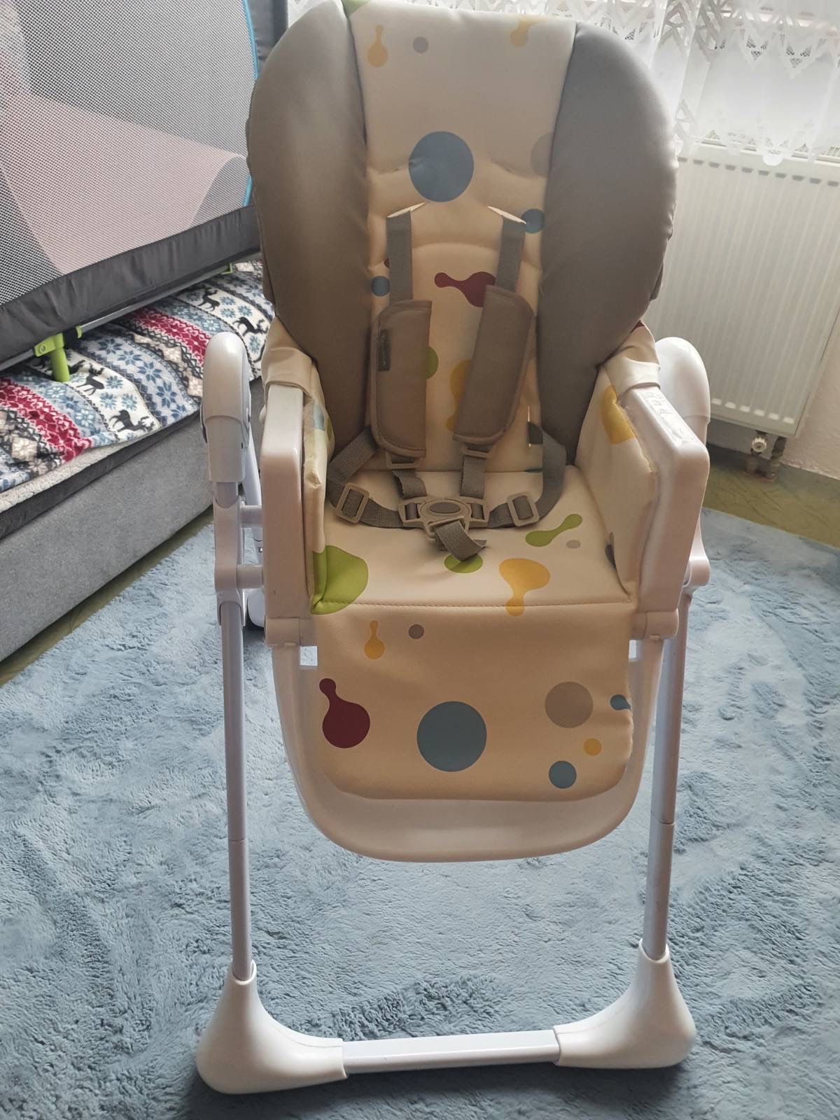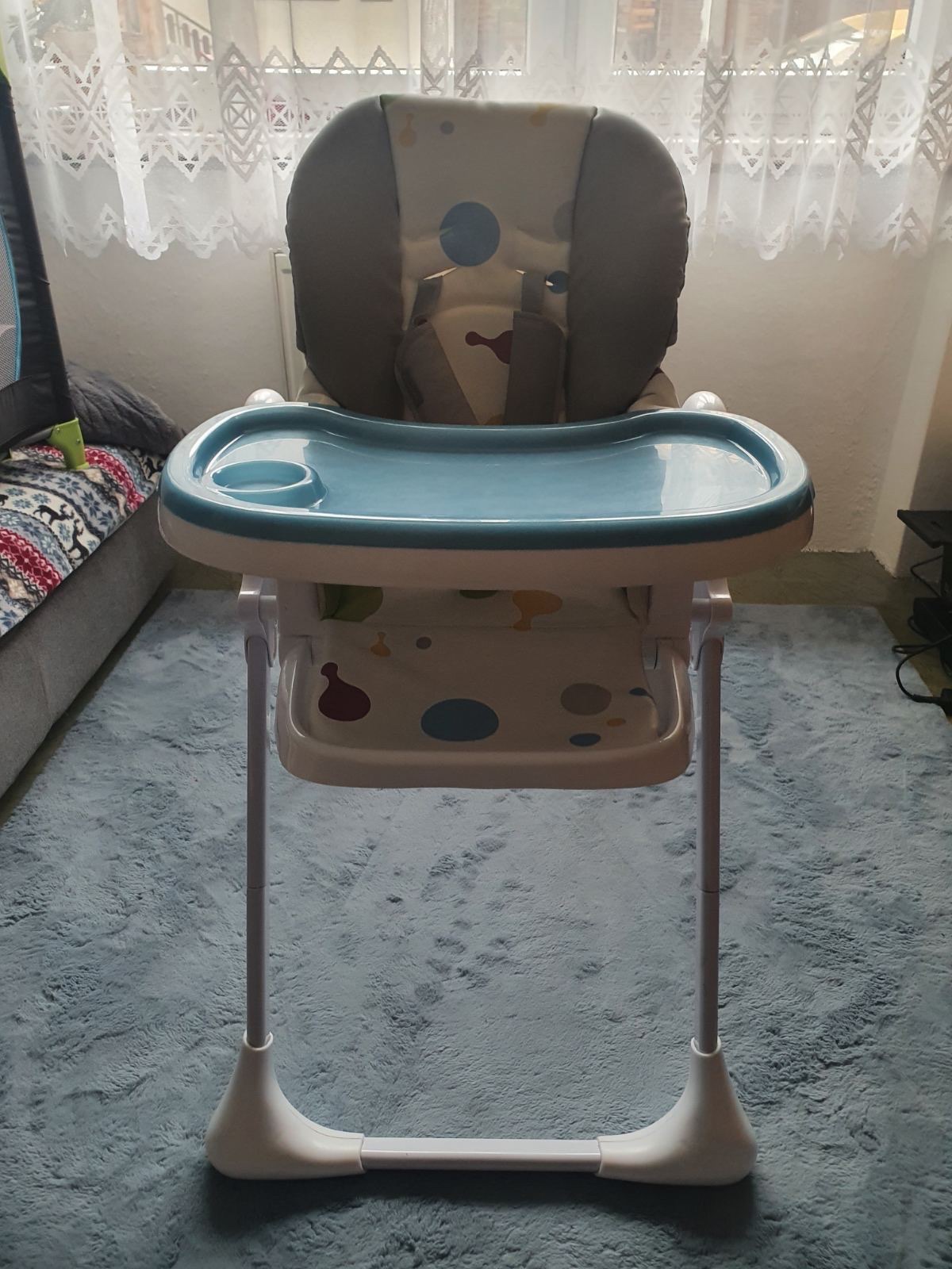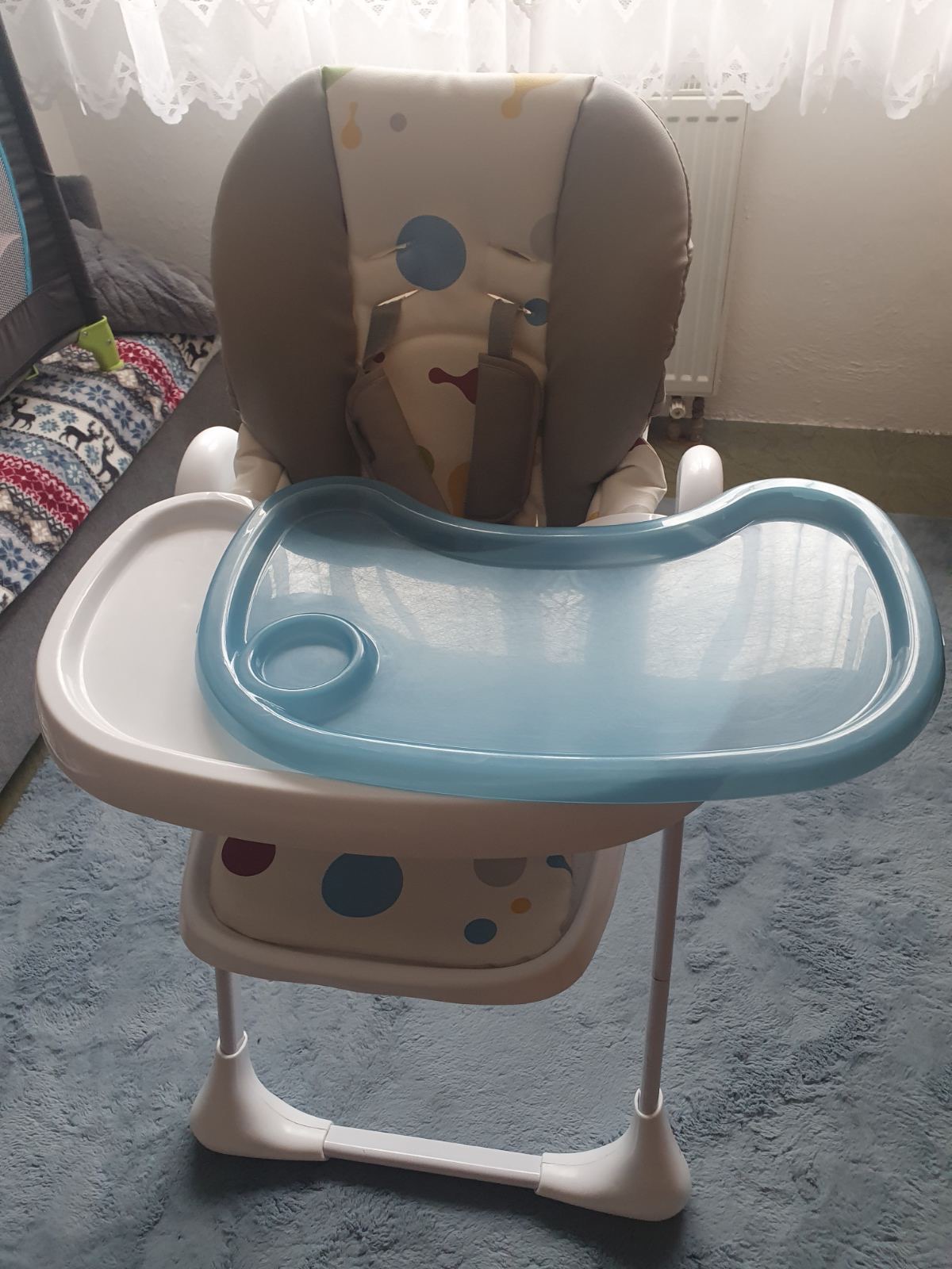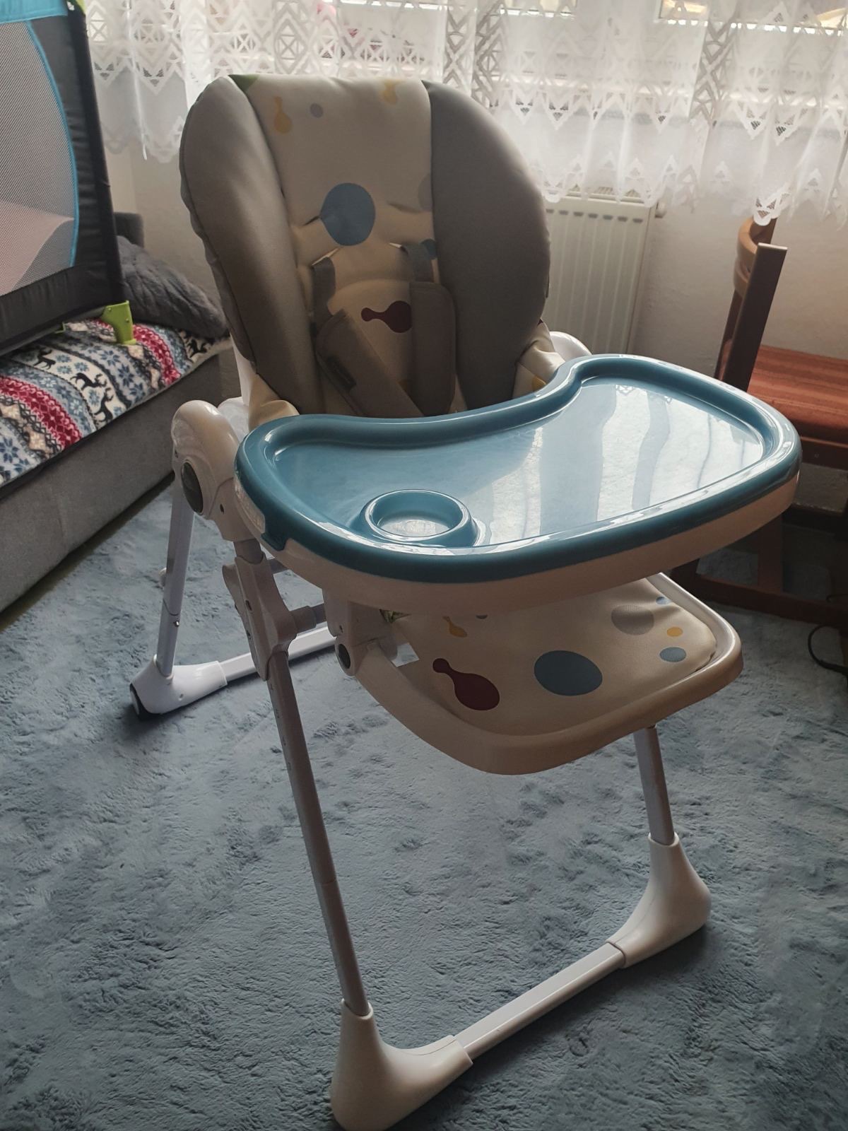 Jedalenska stolička pohodnolna so stabilnym statim, zabrani dieťaťu prevratenie sa na nej. Odnimatelny stolik s ochrannym krytom. Polohovatelna, vyberatelny potah na jemnej strane mierne nadtrhnuty...