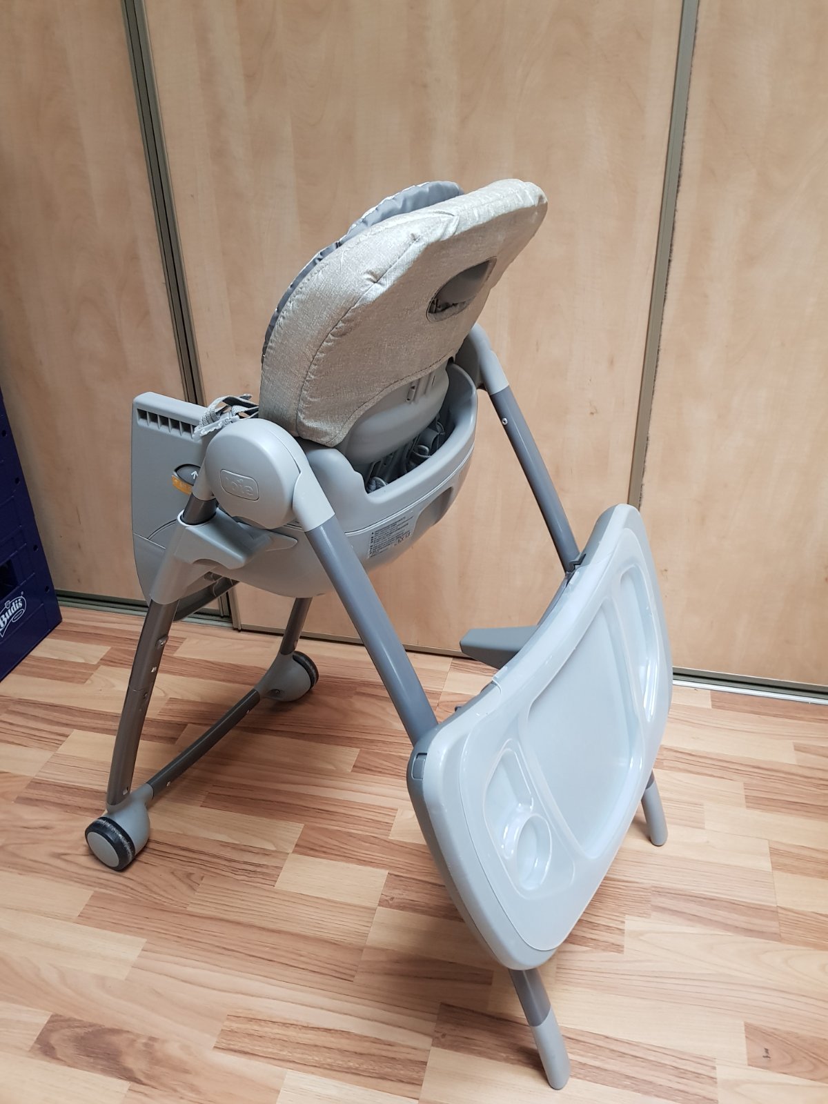 V dobrom stave. Na foto vidieť známky používania. Sklápacia, takže je vhodne aj pre malé dieťatko. Opierka na nohy sa dá tiež regulovať. Stolík sa dá odobrať, taktiež podložka (možné prať v práčke)...
