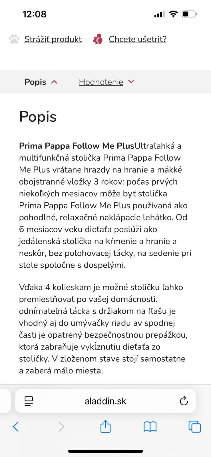 Predám stoličku Peg Perego model Siesta bez originál polstrovaného poťahu.