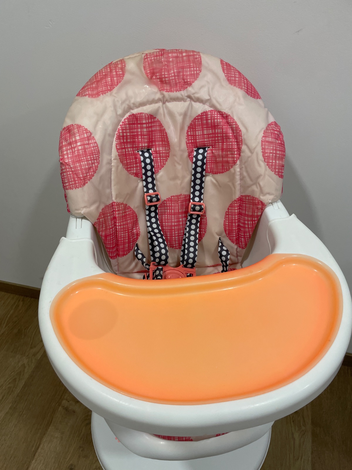 Krasna, kvalitna jedalenska stolicka Cosatto. Vďaka okrúhlemu stredovému stojanu nezaberie veľa miesta a nemusíte sa potkýnať o "nožičky". Naša princezna uz z nej vyrastla a preto ju posuvame dalej… Pultík je odnímateľný.