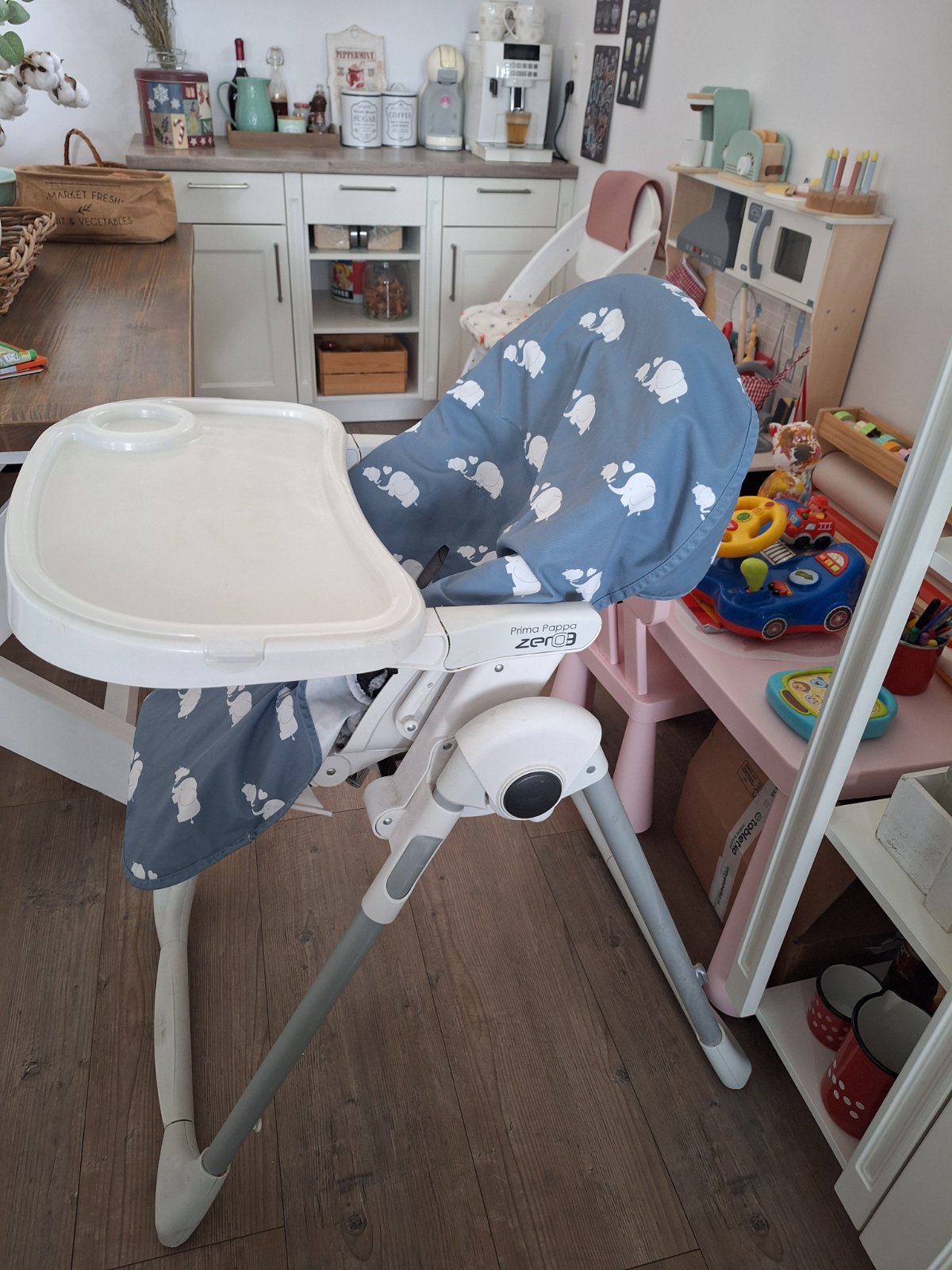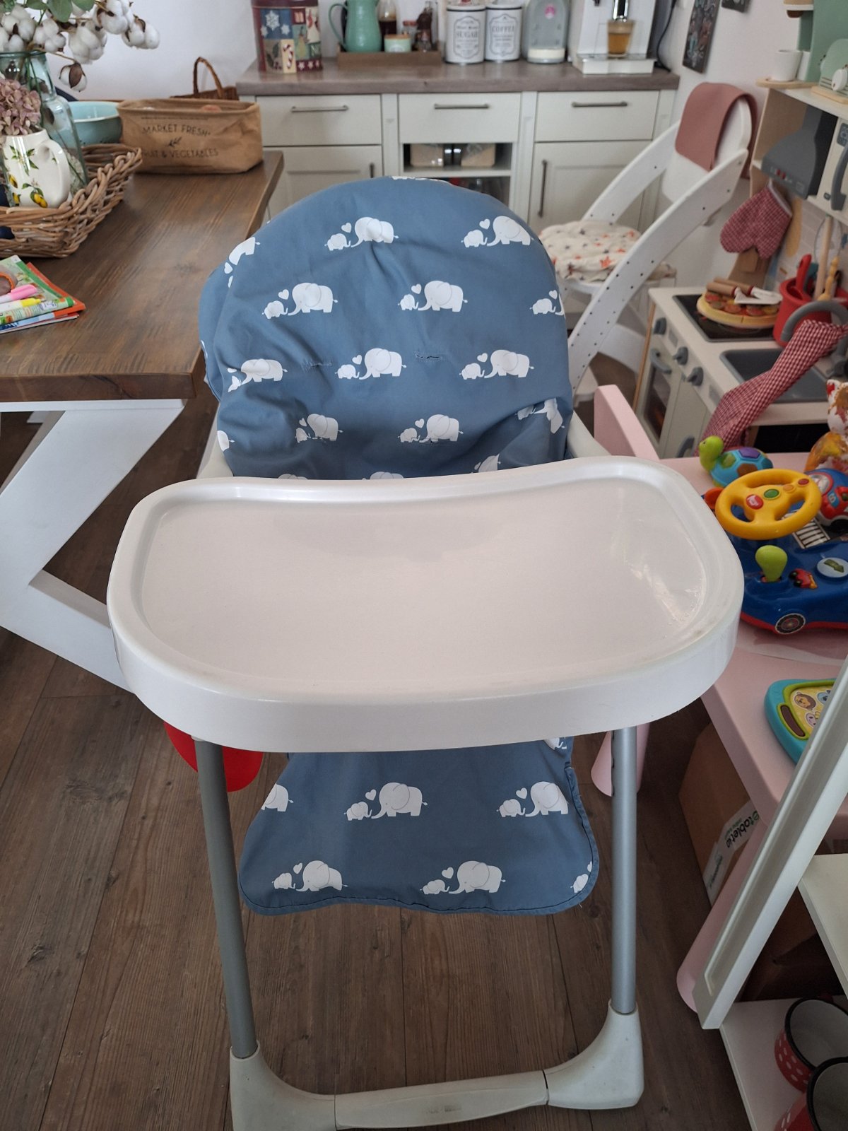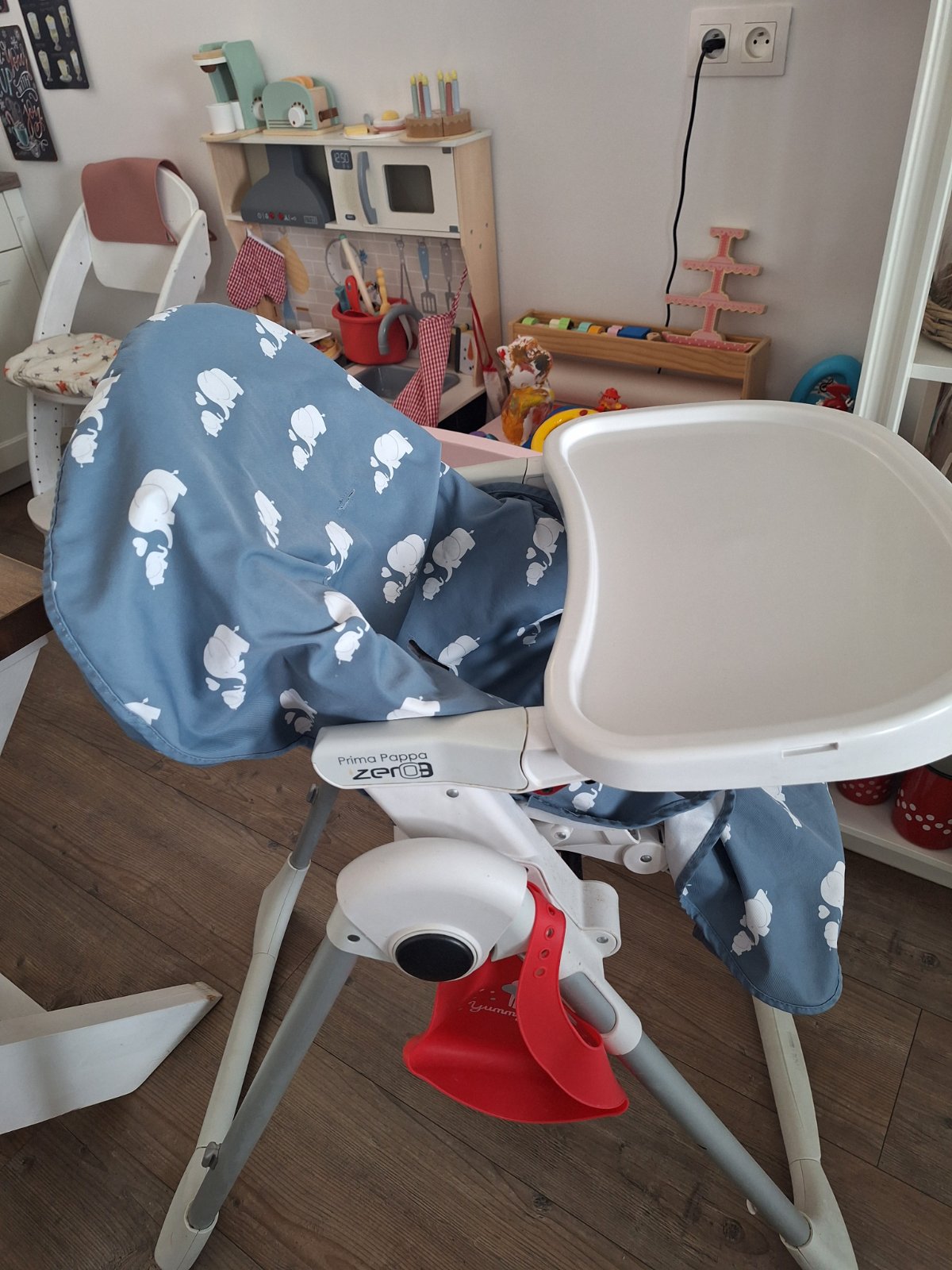 Používaná polohovatelna detska stolicka Prima Pappa . Poťah uz bol mierne poškodený,ale dokupovala som uplne nový modry návlek, takže je opäť ako nová. Vrchná tácka sa dá vybrať pre lepšie čistenie. My sme používali až do 3.rokov, veľmi prakticka