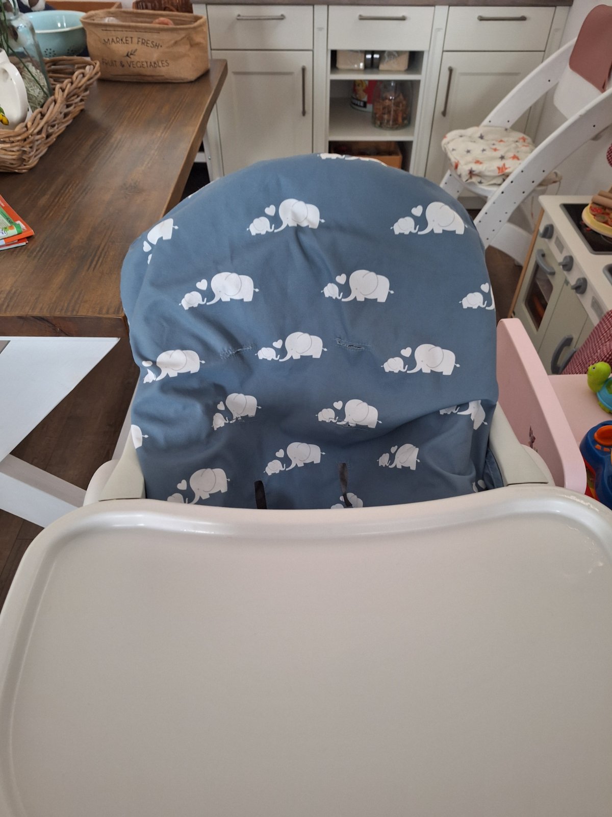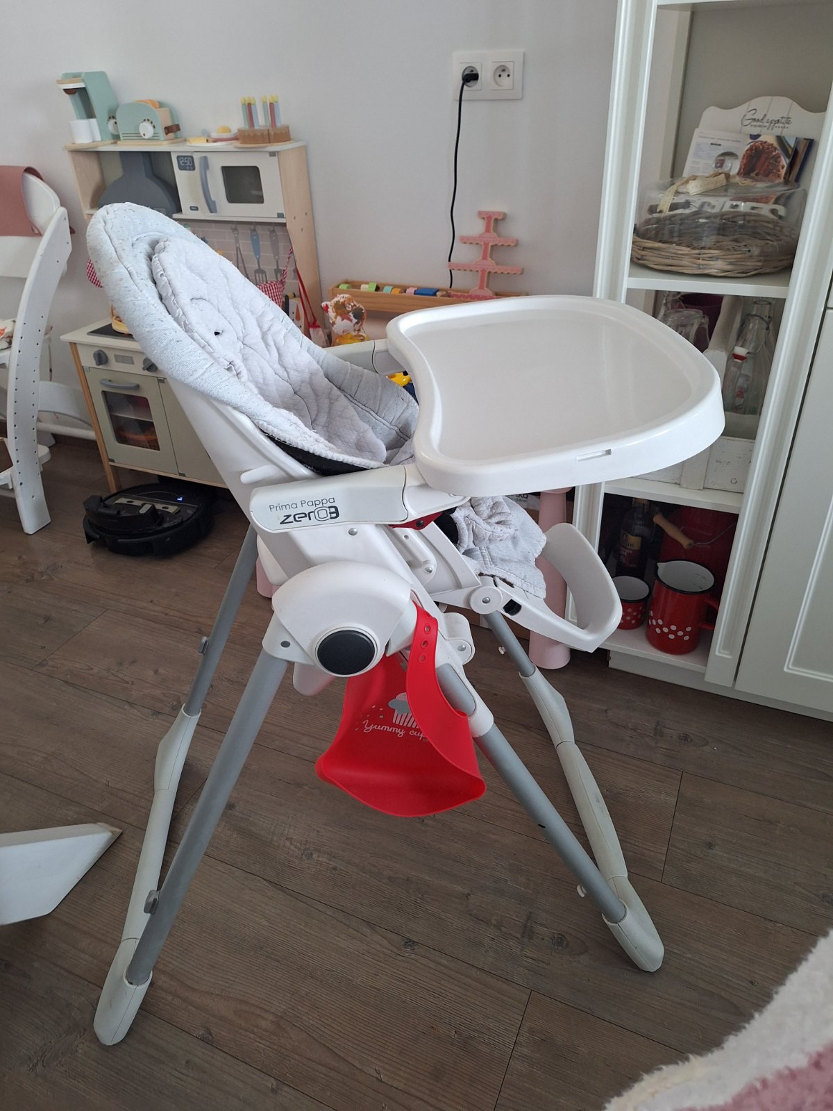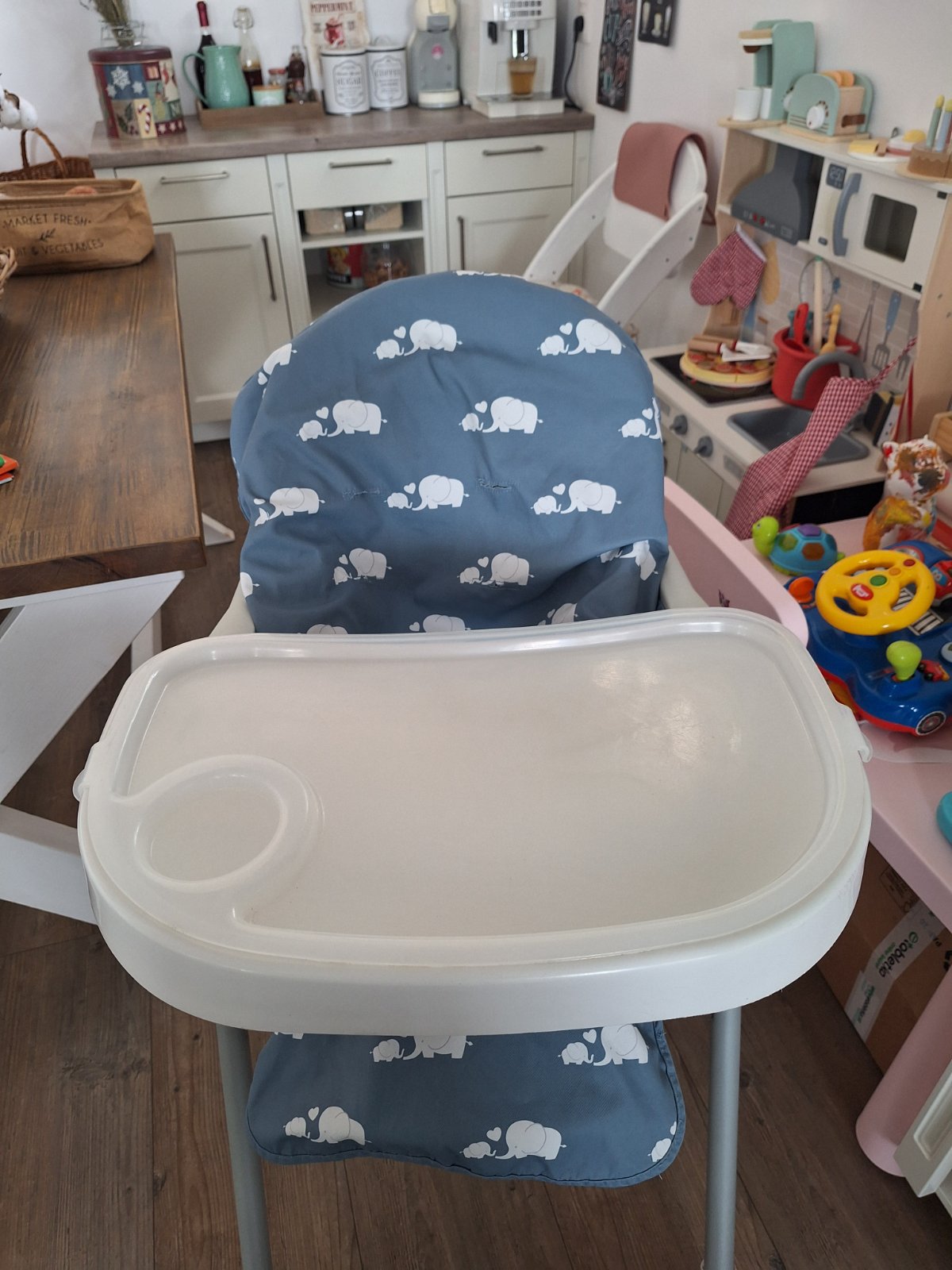 Používaná polohovatelna detska stolicka Prima Pappa . Poťah uz bol mierne poškodený,ale dokupovala som uplne nový modry návlek, takže je opäť ako nová. Vrchná tácka sa dá vybrať pre lepšie čistenie. My sme používali až do 3.rokov, veľmi prakticka