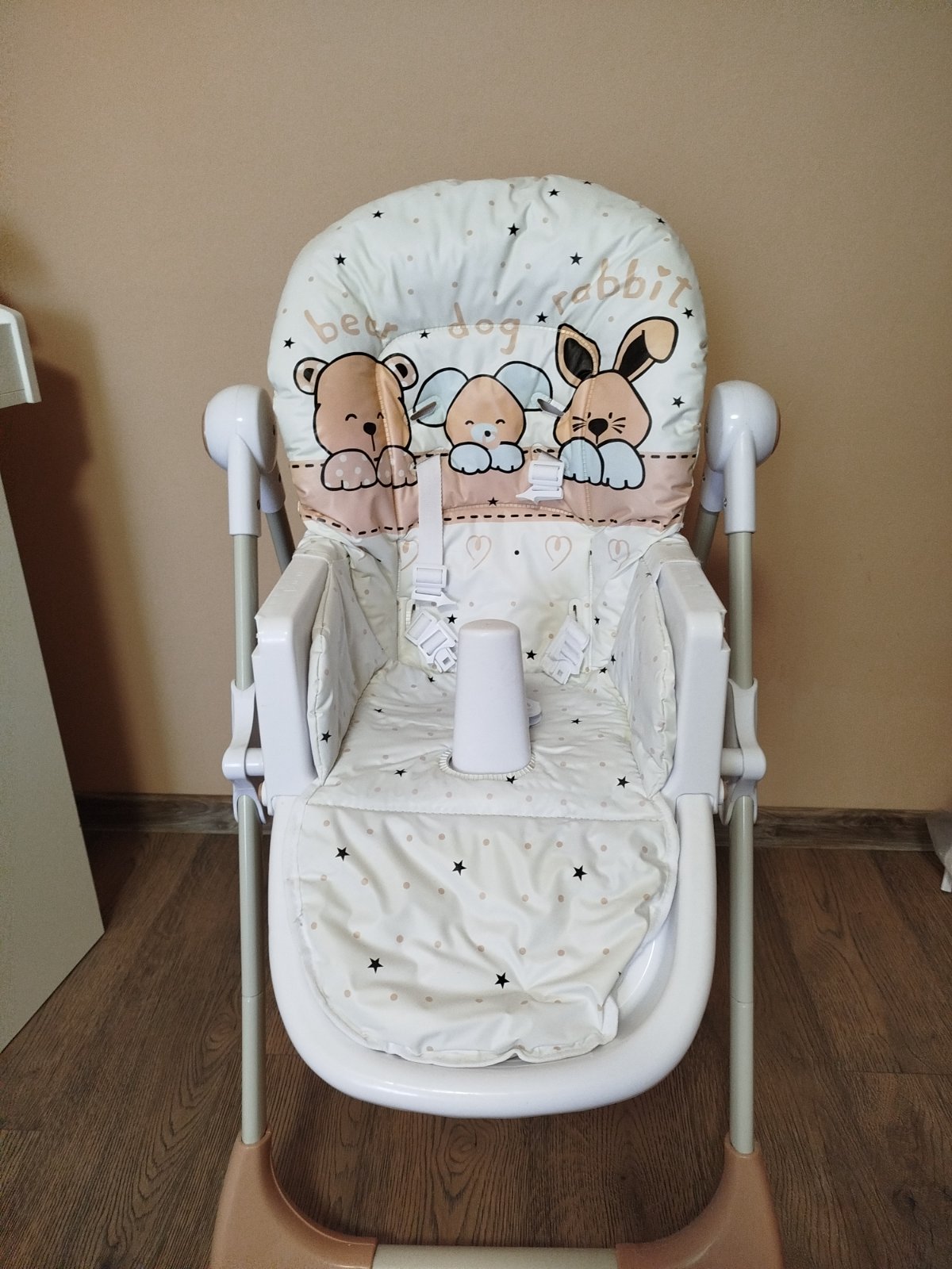 protišmykové nožičky, bezpečnostné pásy, výškové nastavenie, odnímateľný poťah, odnímateľný podnos, kozenka poskodena v casto noh - vid foto. Je s poťahom z eko kože. Stolička má polohovací chrbáti...