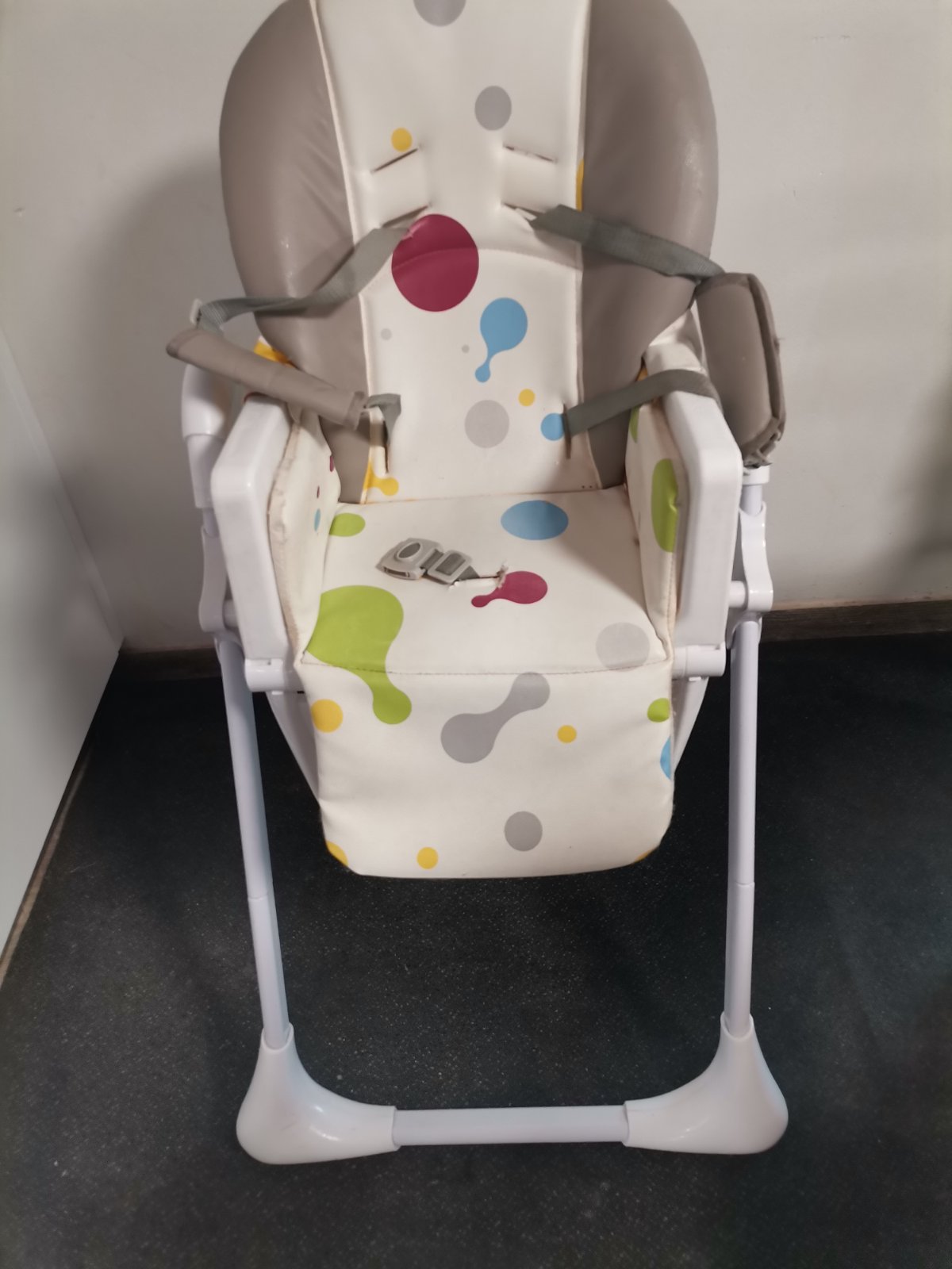 protišmykové nožičky, bezpečnostné pásy, výškové nastavenie, odnímateľný poťah, odnímateľný podnos, kozenka poskodena v casto noh - vid foto. Je s poťahom z eko kože. Stolička má polohovací chrbáti...