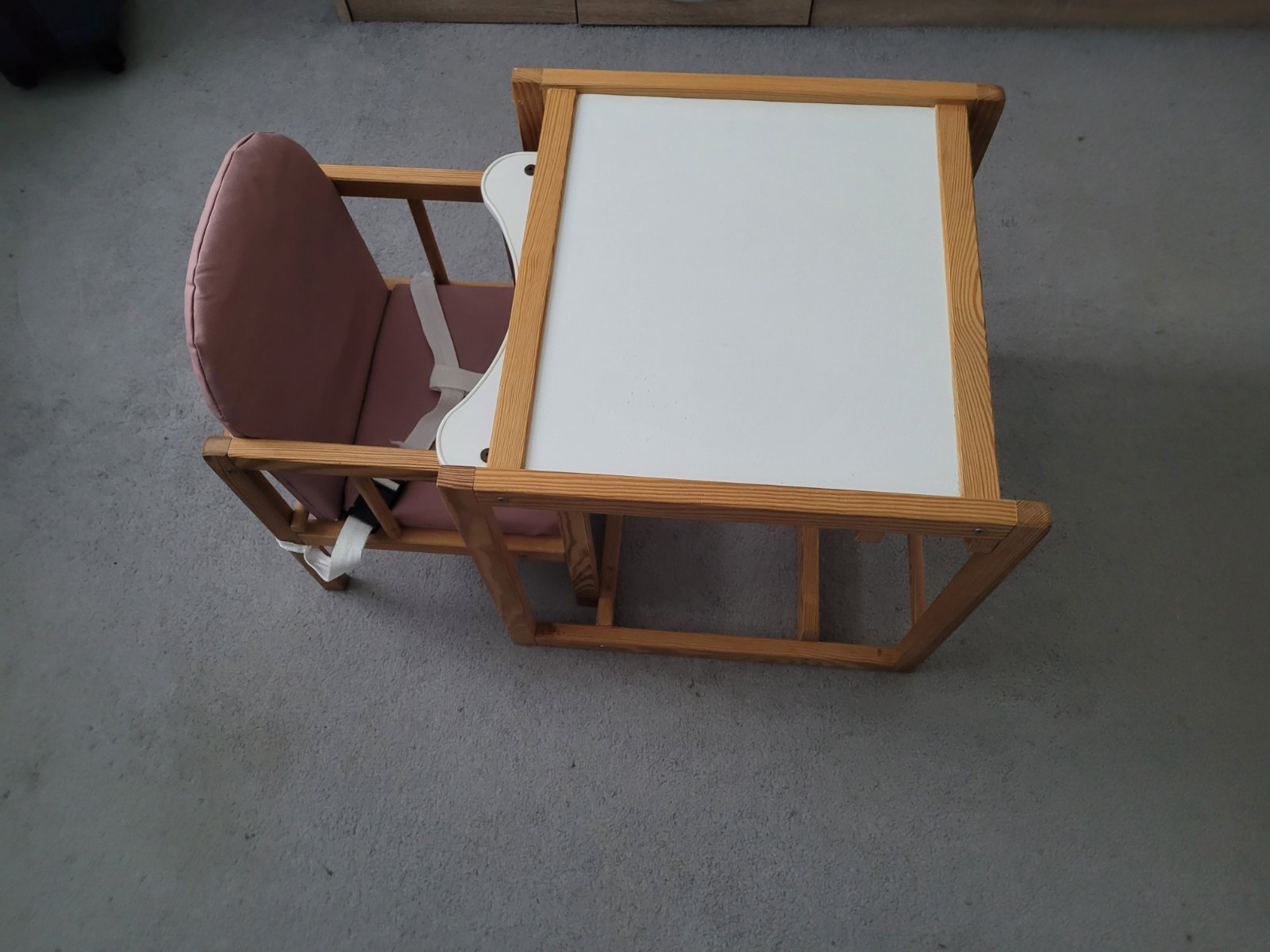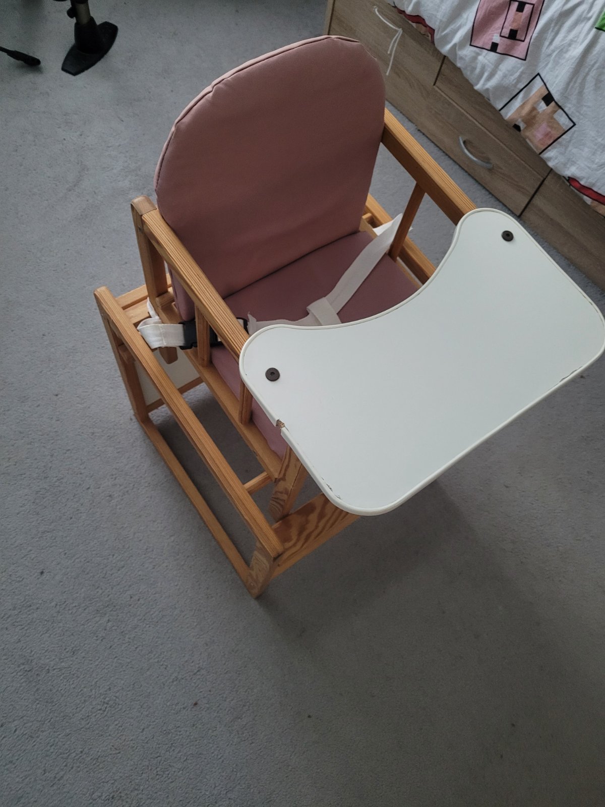 Ponúkam na predaj drevenú veľmi stabilnú stoličku so stolíkom na kŕmenie. Sú na nej drobné oderky, no niekomu ešte určite poslúži. Možná dohoda. Osobný odber v Hlohovci.