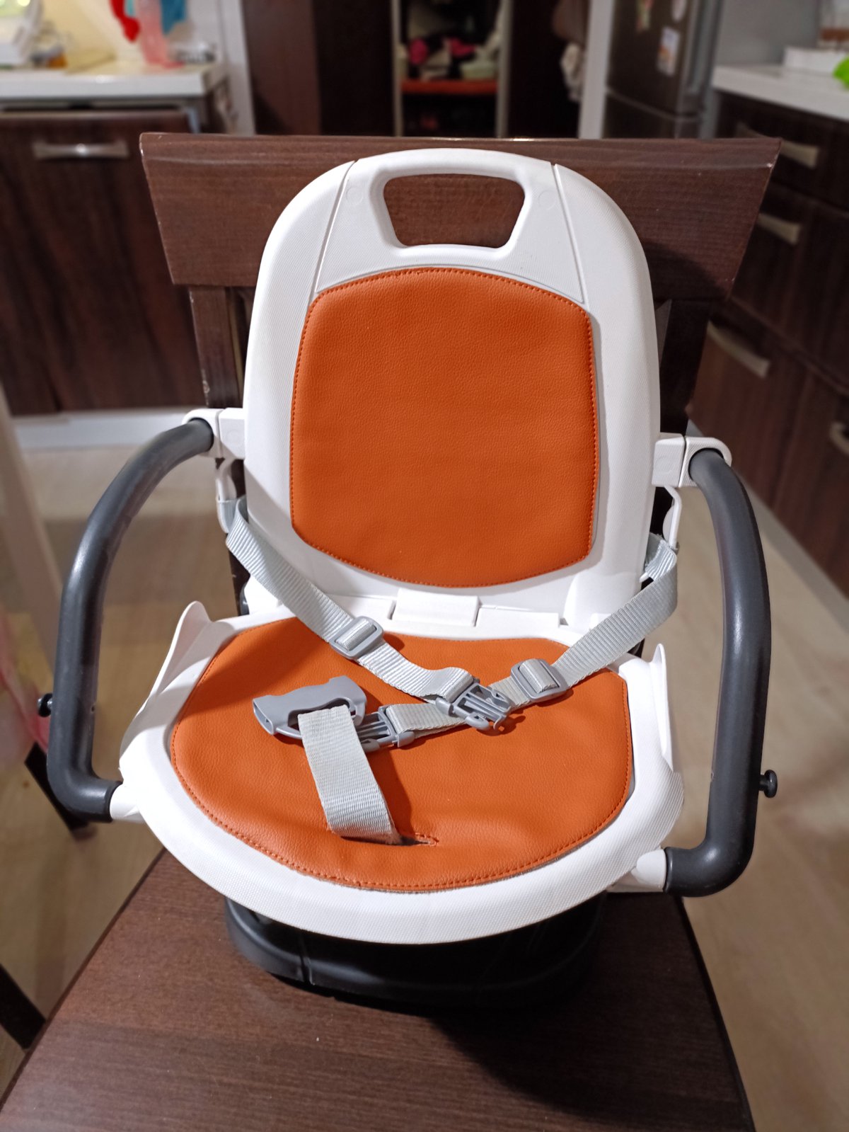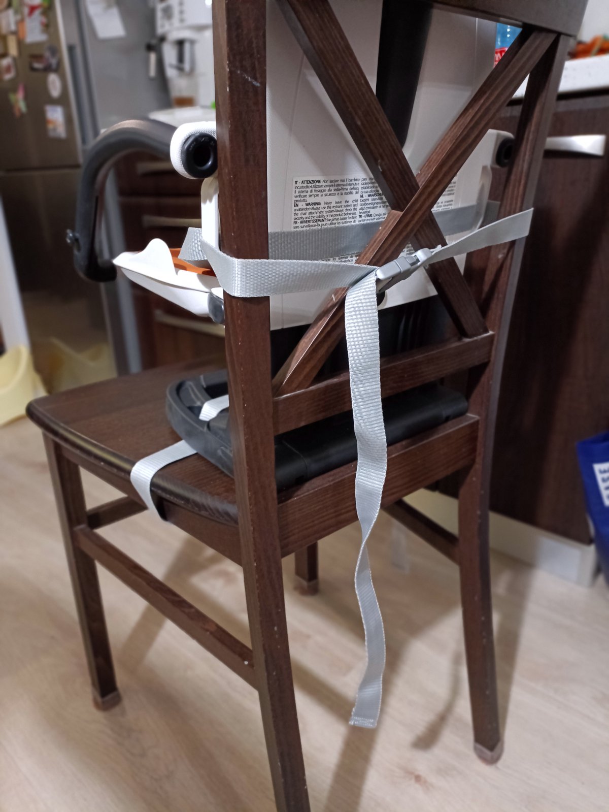 Dá sa úplne jednoducho pripevniť na stoličku, spodným a zadným pásom na zacvakávanie. My sme ju používali nielen ako cestovnú, ale aj doma. Zavadzia úplne minimálne. Výška sedu sa dá nastaviť. Má spoľahlivé trojbodové bezpečnostné pásy a odnímateľný stolček. K stoličke je cestovný obal na prenášanie.