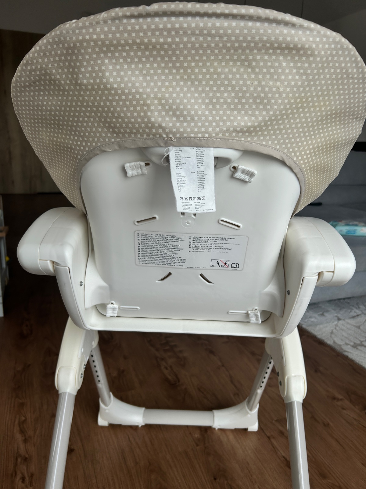 V dobrom stave. Na foto vidieť známky používania. Sklápacia, takže je vhodne aj pre malé dieťatko. Opierka na nohy sa dá tiež regulovať. Stolík sa dá odobrať, taktiež podložka (možné prať v práčke). Sedačka je na kolieska, takže sa dá pekne posúvať.
