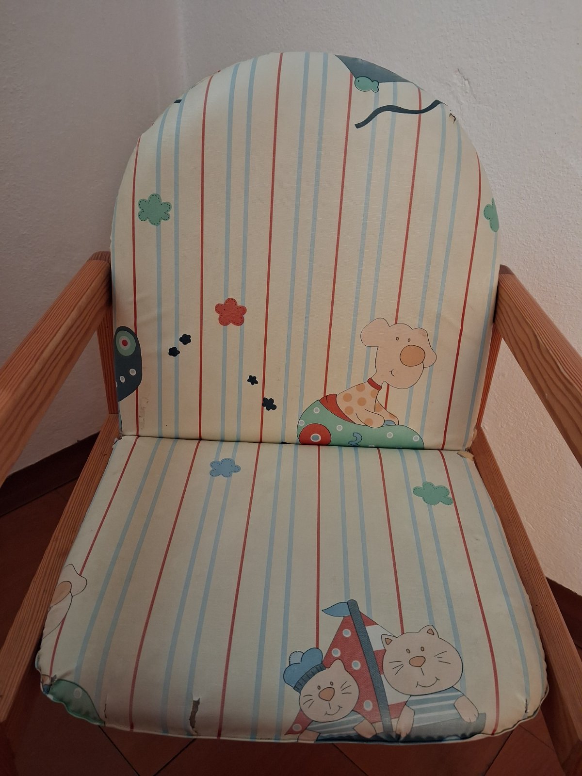 Detské drevené stoličky. Menšia - vhodná od prvých príkrmov do max. 2 rokov. Original potah na niektorych miestach povolil, takze som na stolicku usila bavlneny potah so zvieratkami. Je na suchy zi...