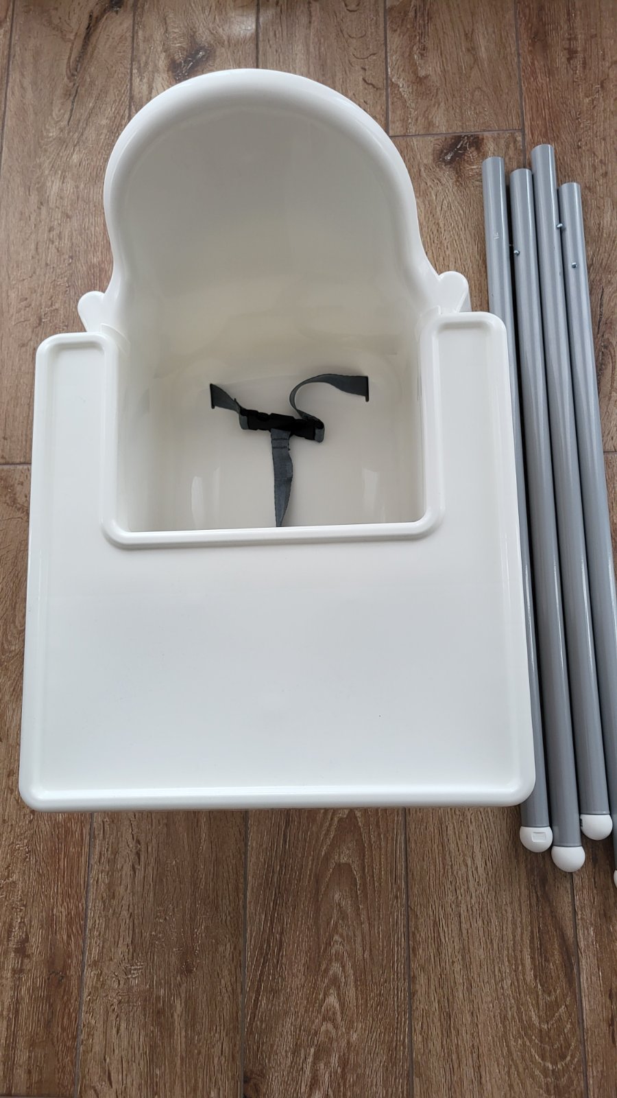 Stolička je aktuálne poskladaná. Je vo veľmi dobrom stave. Biely podnos sa dá vybrať a umyť.