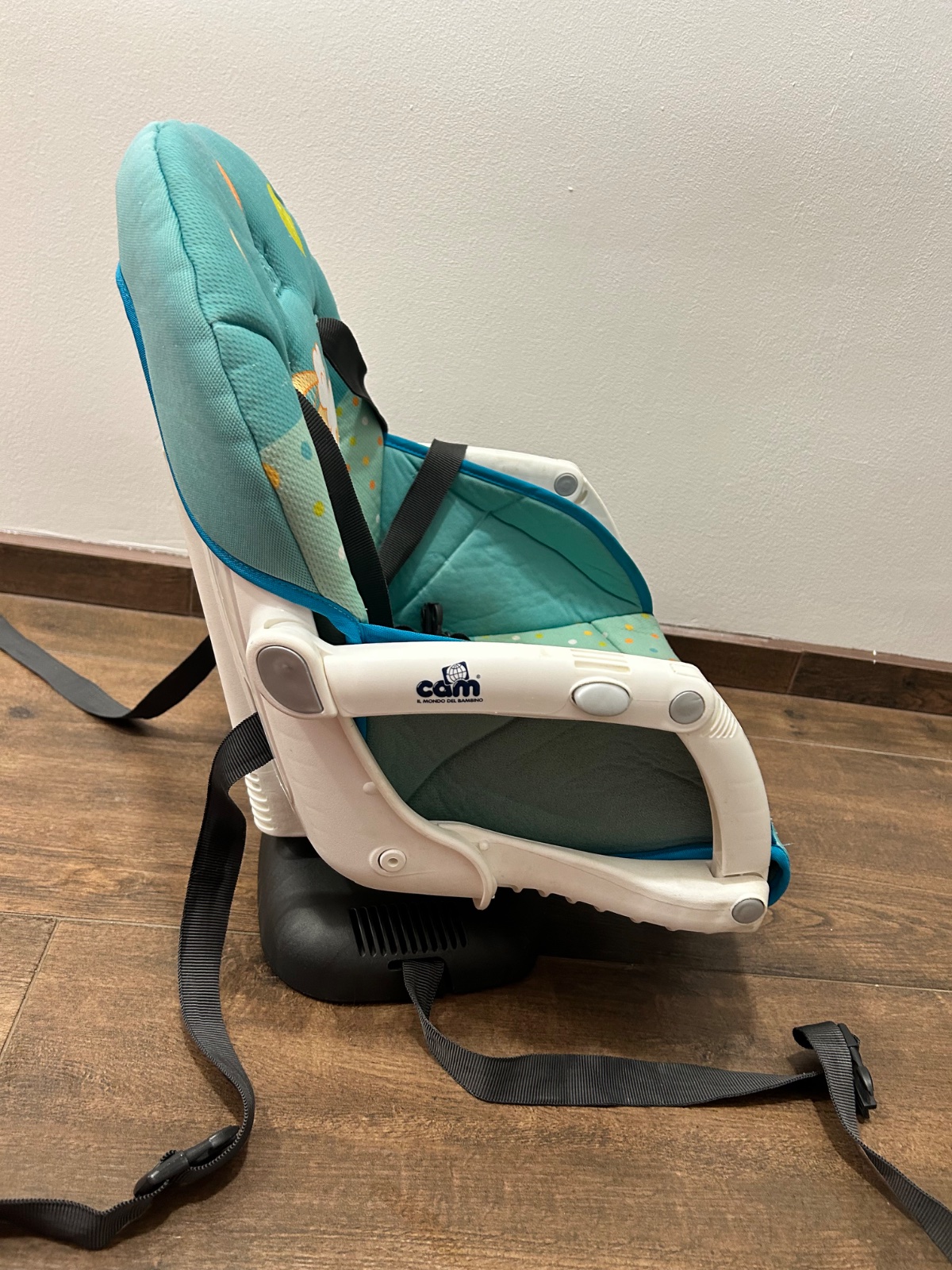 CAM Jedálenská stolička Idea má univerzálny fixačný mechanizmus na stoličku, kde pomocou bezpečnostných pásov sa stolička Idea pripevní k operadlu na akýkoľvek typ stoličky. Vďaka tomu si deti môžu užiť večeru i obed mimo domova pri jednom stole s rodičmi.