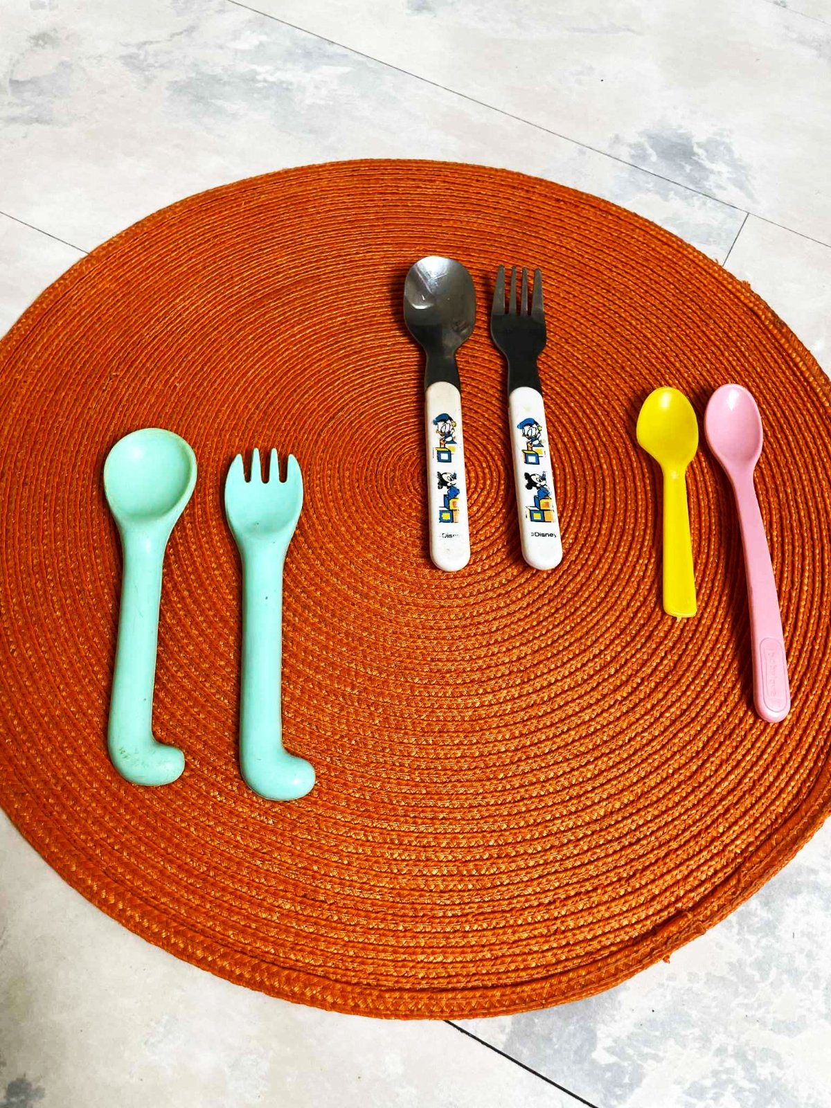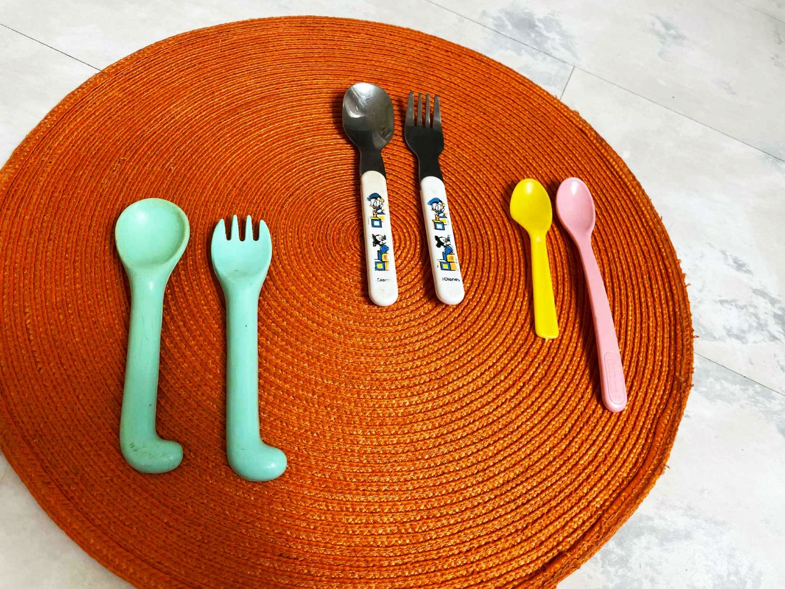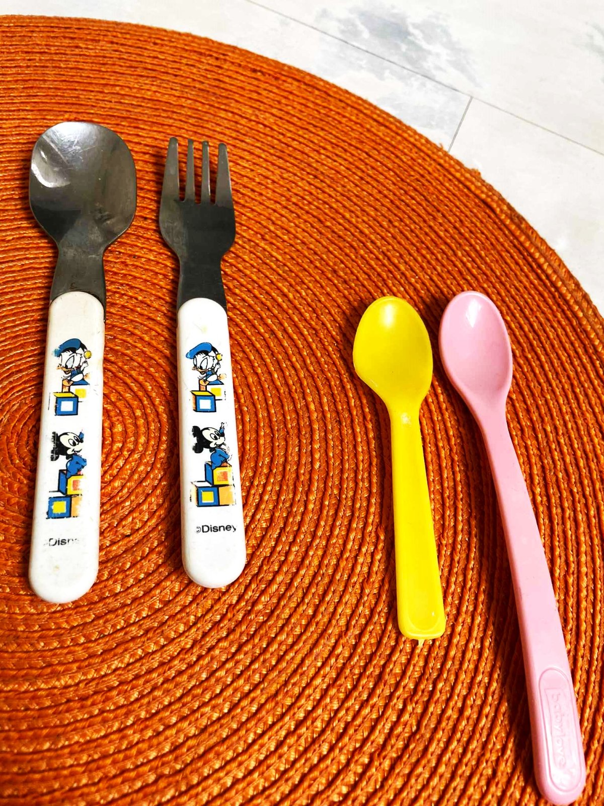2 sady detského používaného príboru pre malé detičky ktoré sa snažia papať samé,kvalitný plast,vhodné aj do myčky