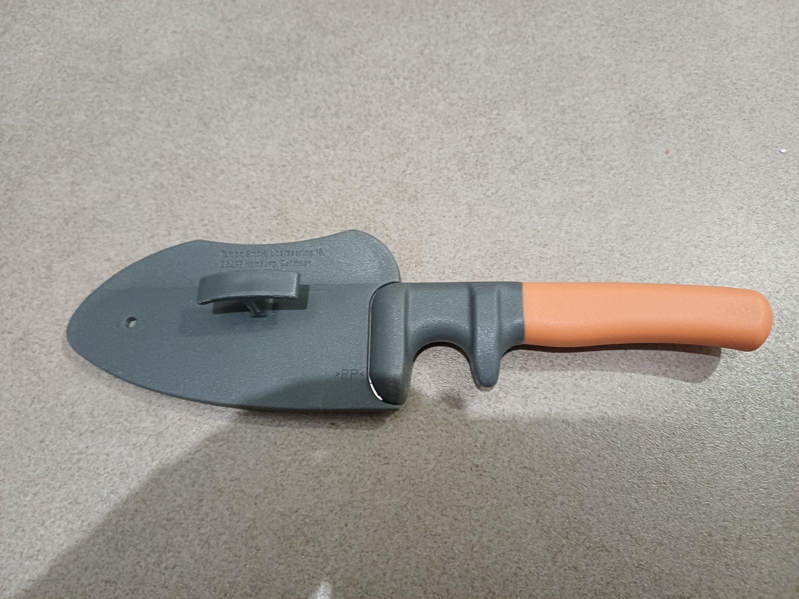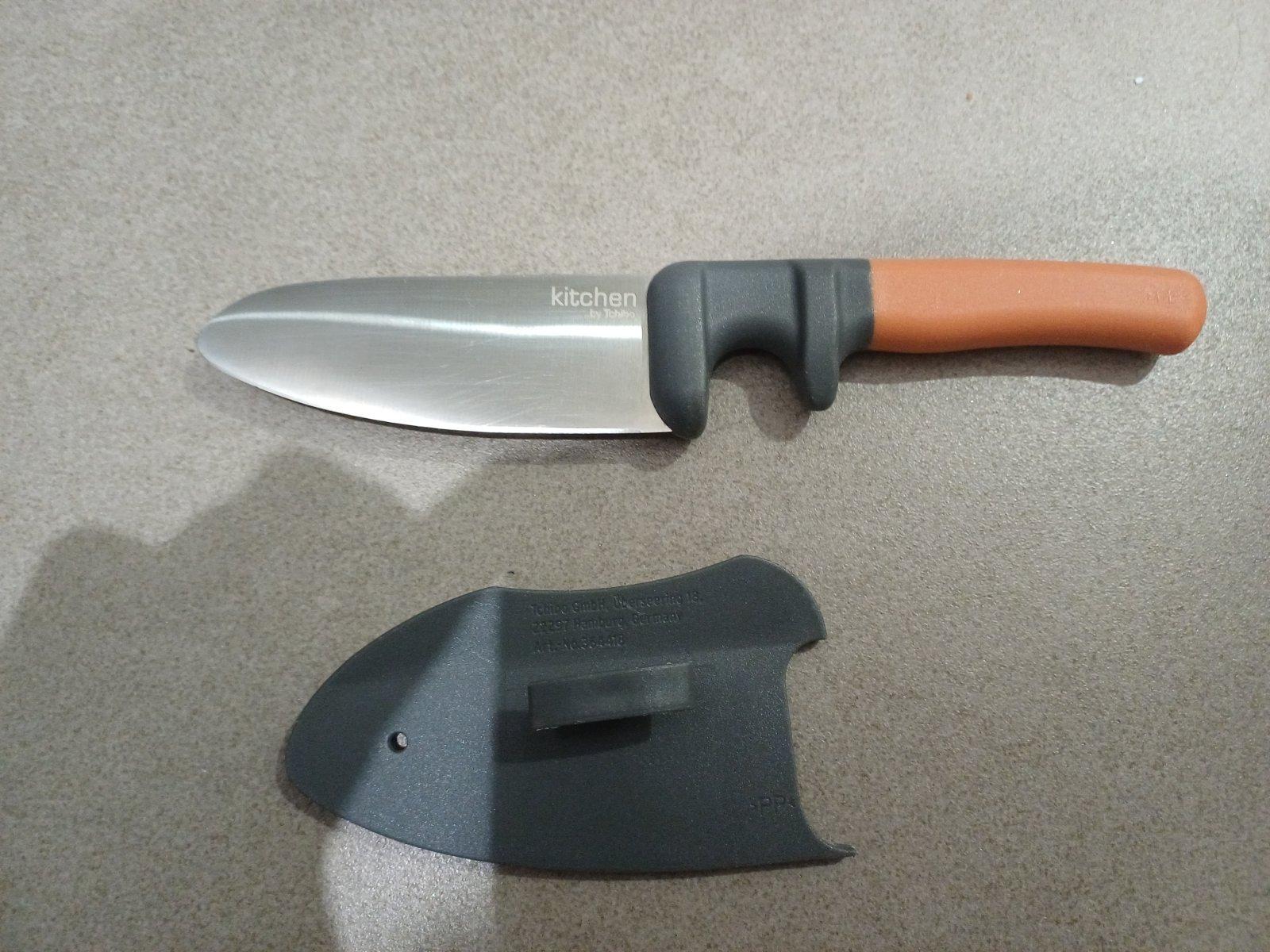 Predám kvalitný detský nôž z Tchibo s ergonomicky tvarovanou rukoväťou, so zaoblenou čepeľou aj s chráničom prstov, ktorý zaroveň slúži ako púzdro na čepeľ. Vhodný aj pre ľavákov, vyrobený z kvalitnej nehrdzavejúcej ocele.