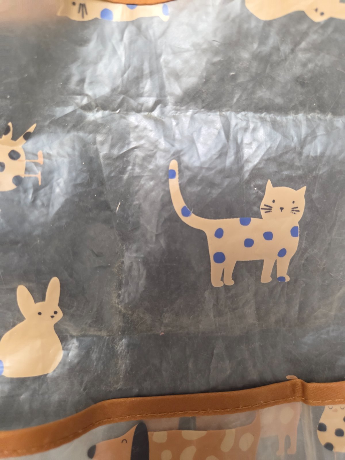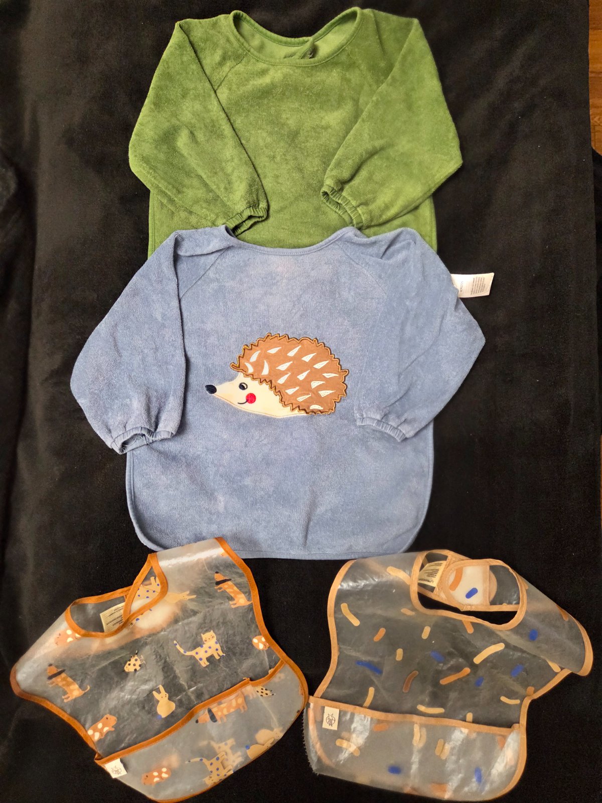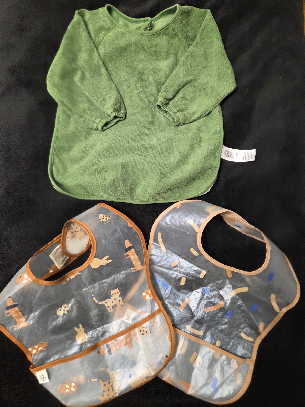 rukavmi. Zvonka frote, zvnutra nepremokavy prijemny material, dieta sa v nom nepoti ako v tych celogumenych. Jeden ma svetle miesto pod krkom, ale inak su oba v peknom stave.