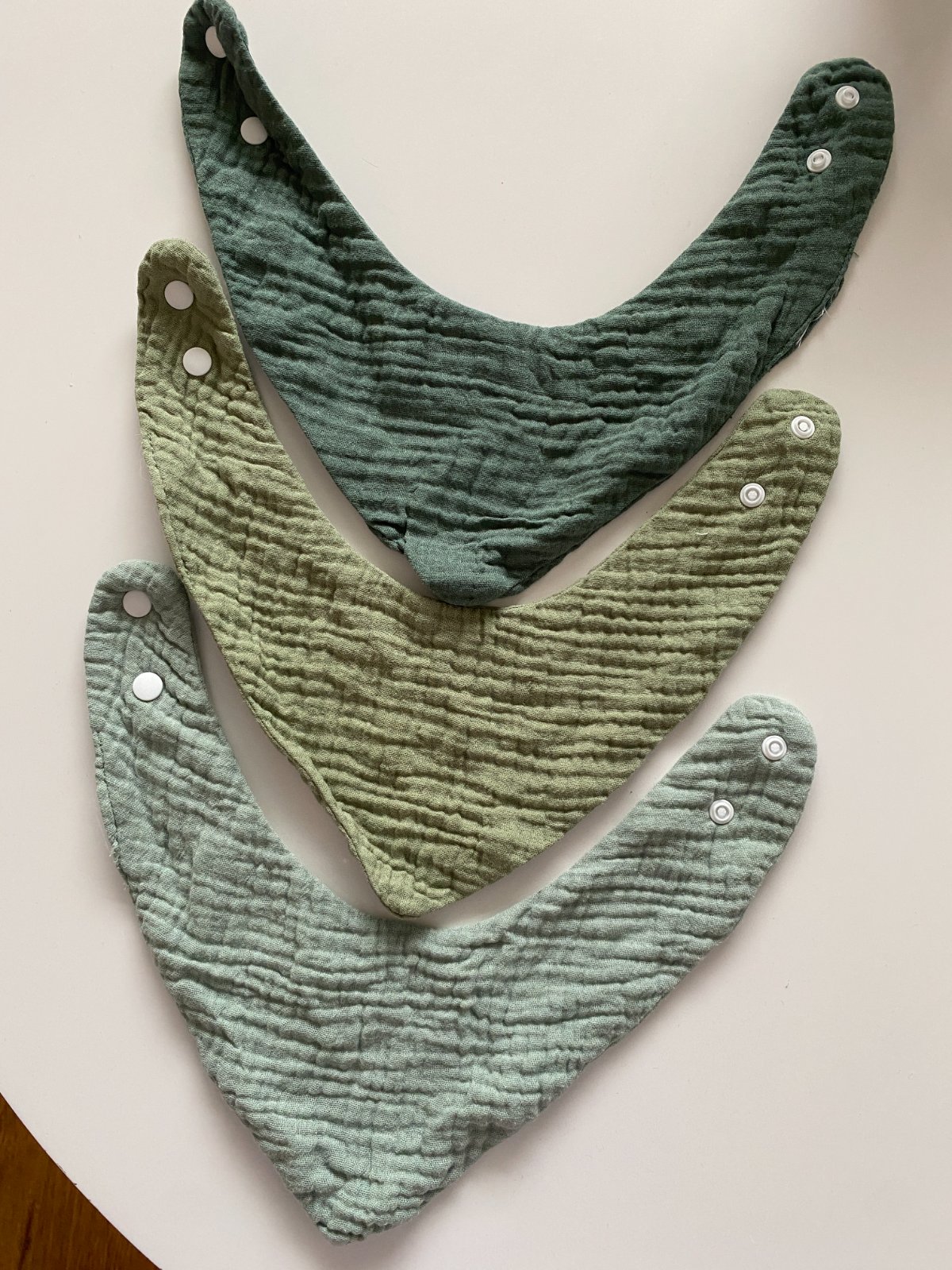 Set dvoch bavlnenych podbradnikov znacky Lupilu. Daju sa pouzit obojstranne, zapinanie okolo krku na cvocky, da sa regulovat velkost. Prijemny makky material.