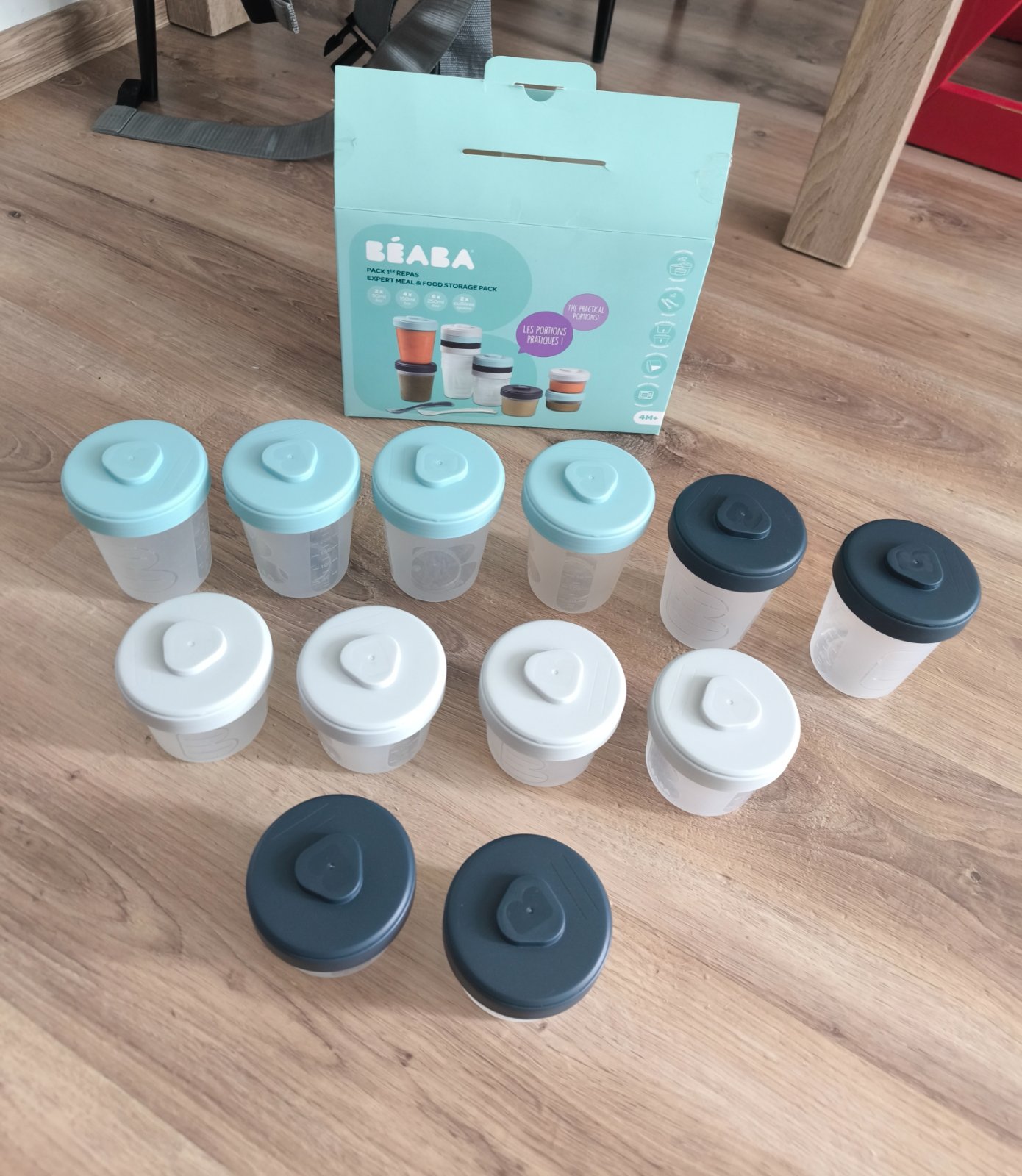 Nádobky na prvé príkrmy alebo uskladnenie. Asi 3 boli raz použité ináč nové. Lyžičky akurát už nie sú.