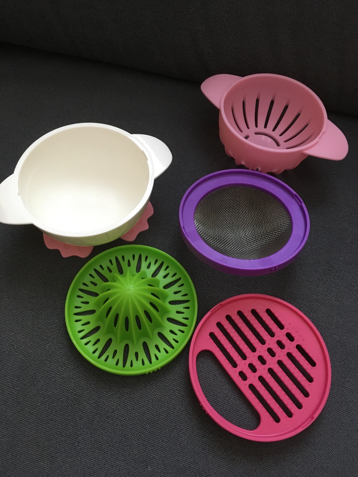 Set : odšťavovač, struhadlo, hmoždíř včetně paličky a silikonovým krytem, cedník, misku a protiskluzovou podložku.