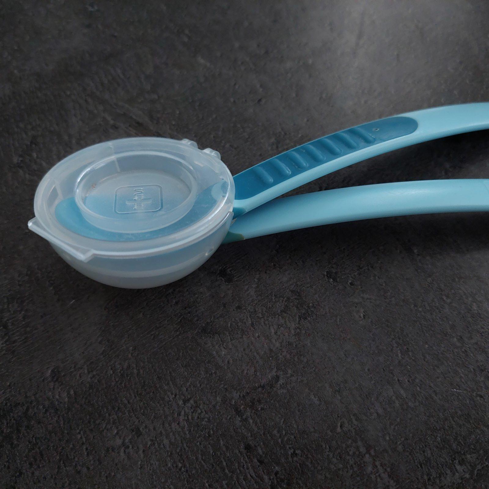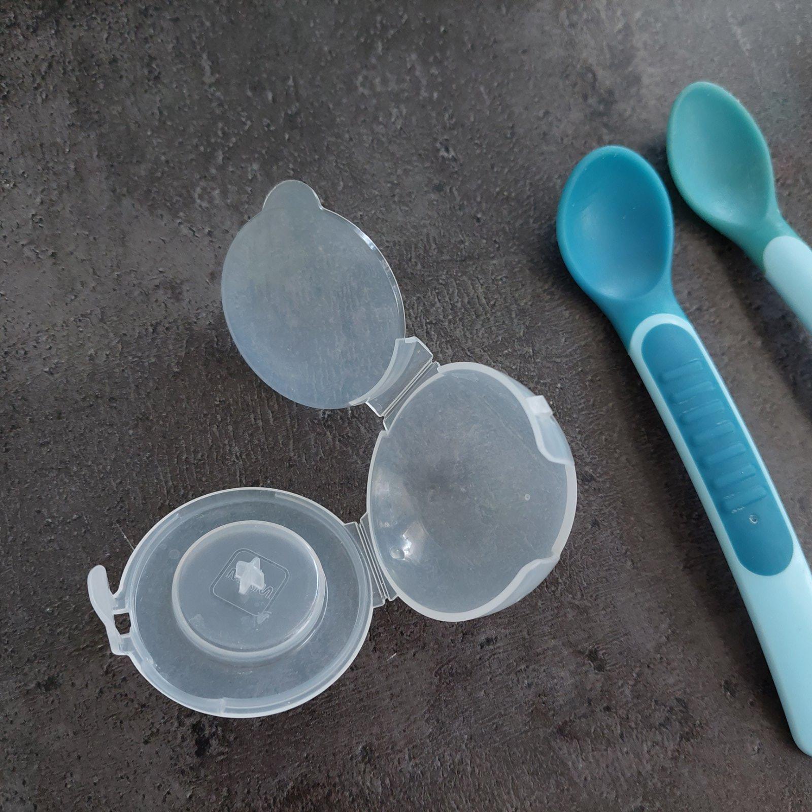 2 lyžičky + kryt s dvoma priehradkami, ktoré hygienicky držia lyžičky od seba