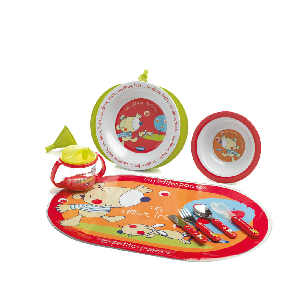 edálenská súprava s termotanierom. Súprava zahŕňa:1 prestieranie, 1 miska, 1 termotanier, 1 lyžička, 1 silikónová lyžička, 1 vidlička, 1 nôž, 1 hrnček + nasadzovací lievik na pitie. Vhodné do umývačky riadu. Termotanier s protišmykovou úpravou. Nerezový príbor.