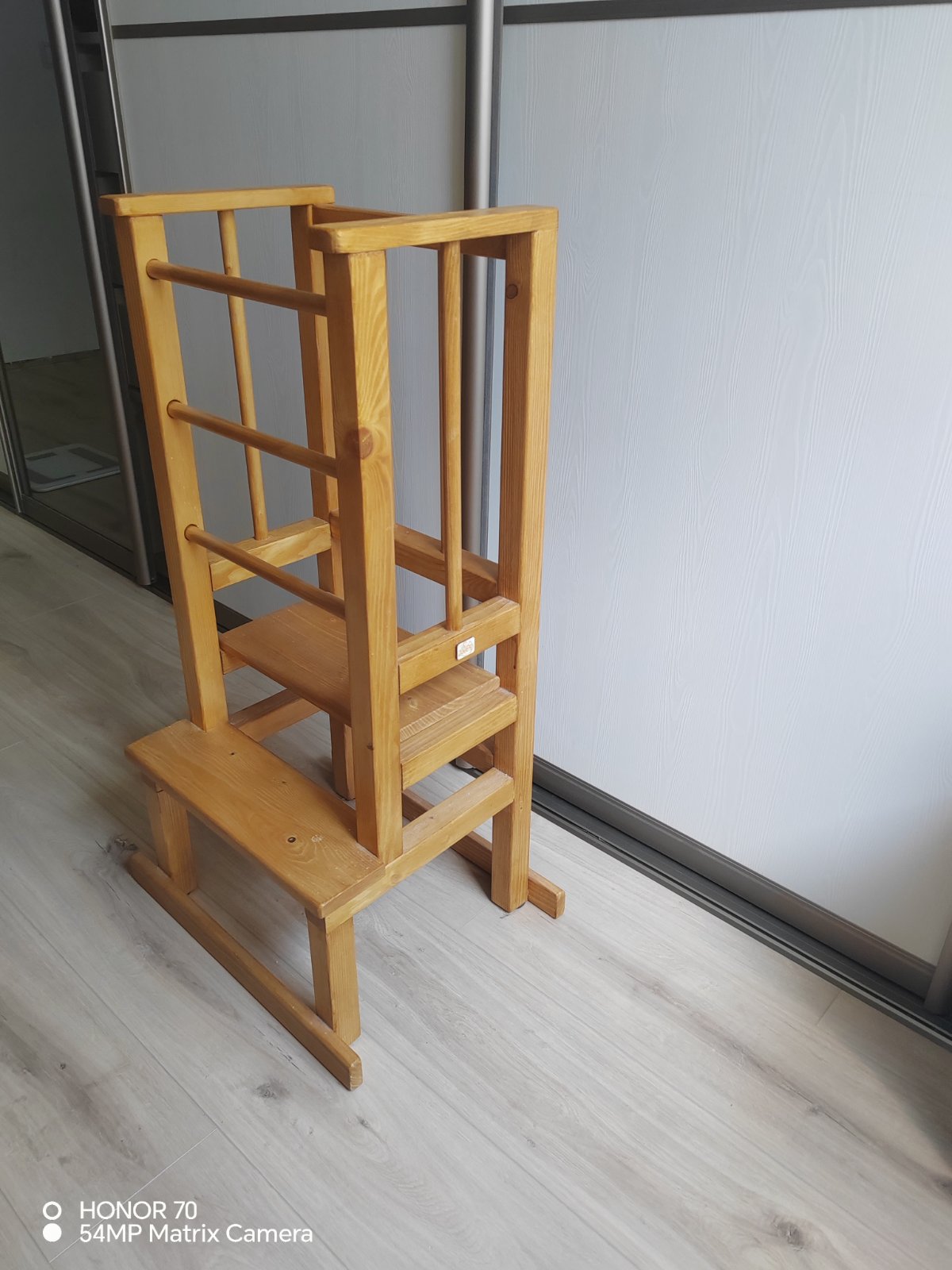 Učiaca veža Zoody. Tri výškové polohy. Drevo, smrek. Bezfarebný lak, pekný vzhlad dreva. Bez poškodenia , ako nová. Výborná vec do kuchyne a hlavne kúpelne.