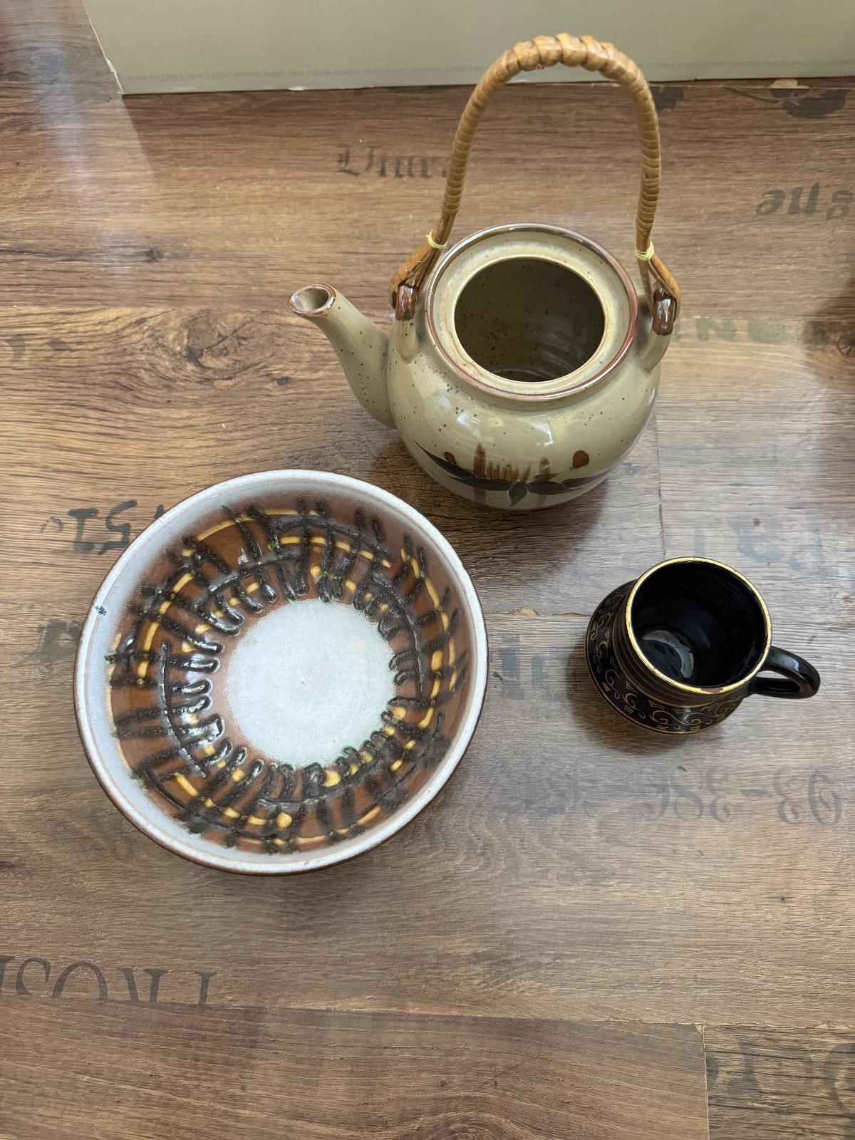 Ponúkam retro misku, potom značený kalištek / hrnček a zaujímavú nádobku na čaj ale bez vrchnáčika, rúčku má pletenú bambusom alebo čo to je..;) Všetko je už staršie… Cena za všetko spolu. Poštovné podľa taríf.