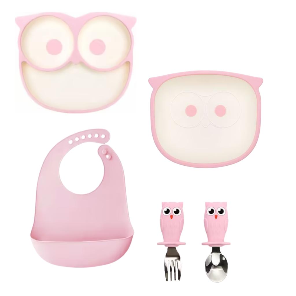 Viacdielna jedálenská súprava pre deti s krásnym sovičkovým dizajnom, ktorý je ľahko umývateľný a vhodný aj do umývačky riadu. Navyše je zárukou zdravotnej nezávadnosti a bezpečného stravovania – vďaka prísavke na vonkajšom dne priľne k stolu, čím je zaručená jeho stabilita. Rukoväť príboru je tvarovaná tak, aby si dieťa trénovalo úchop a škvrnám na oblečení zabráni podbradníku s praktickým a dĺžkovo nastaviteľným zapínaním.