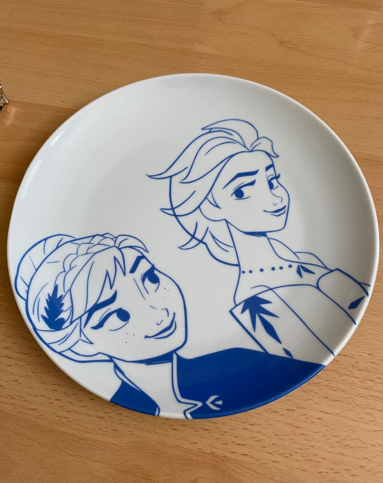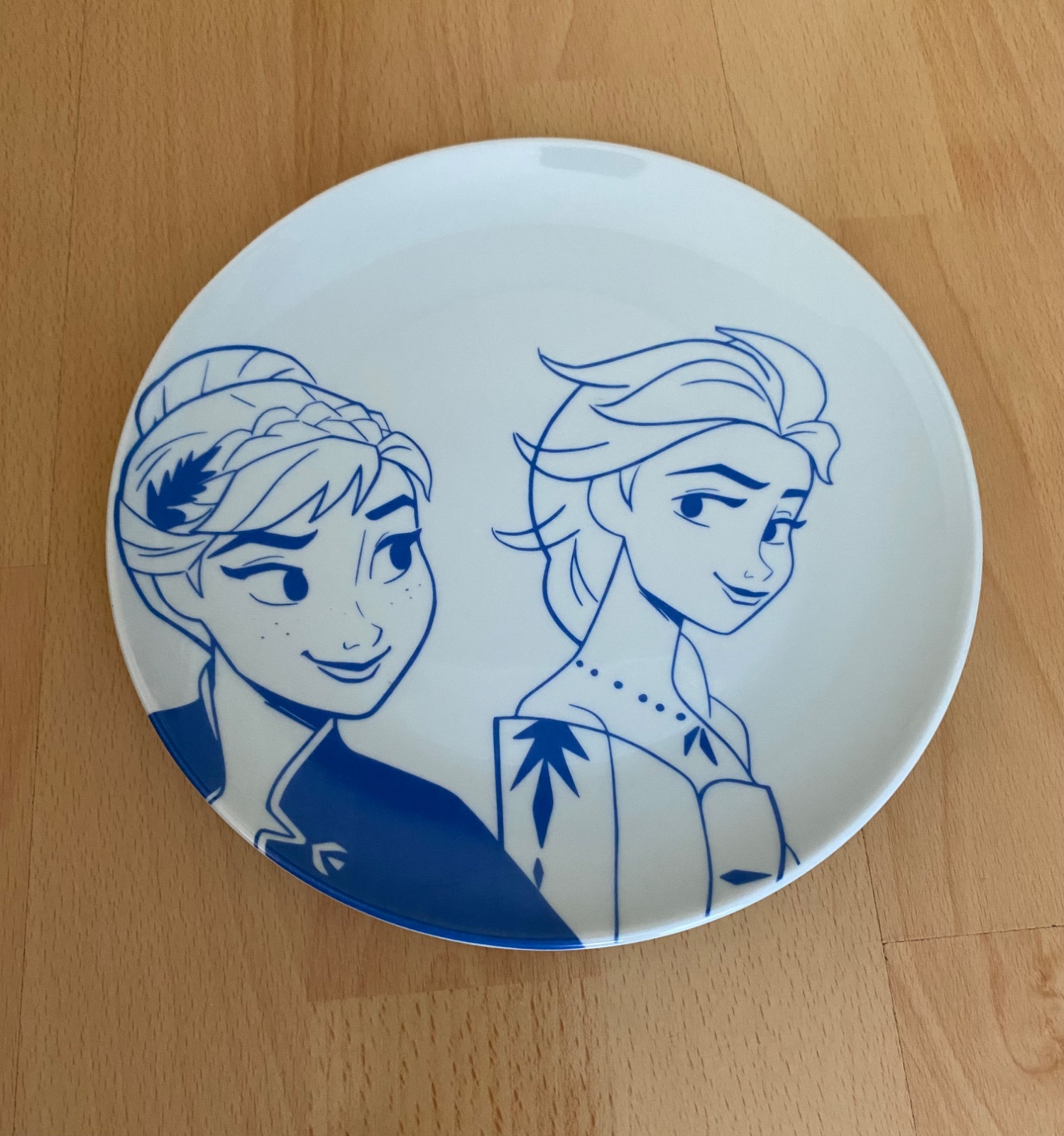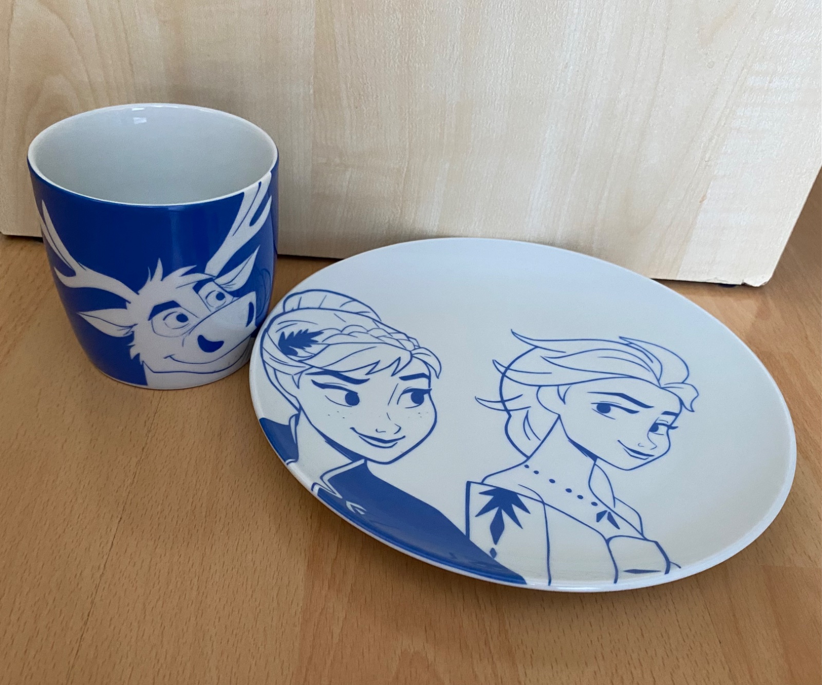 Sada hrnček a tanier s motívom rozprávky Ľadové kráľovstvo II. Príležitostne použité, ako nové. Bez poškodenia. Farba modrá a biela. Rozmery na foto. Porcelán.