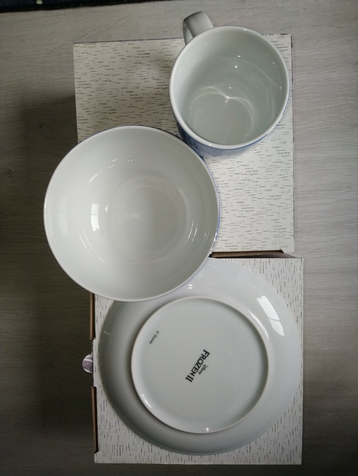 Raňajková sada keramického riadu, obsahuje malý tanier, misku a hrnček.