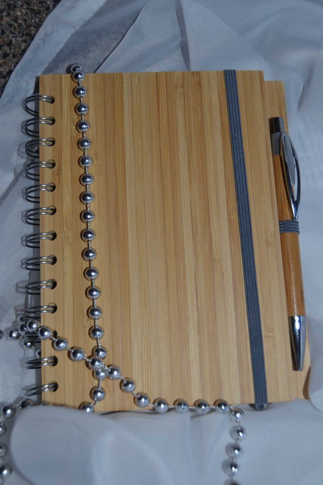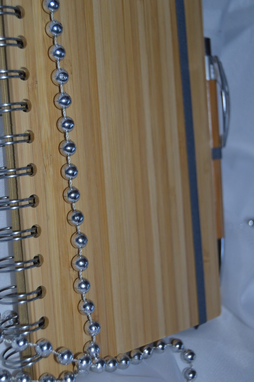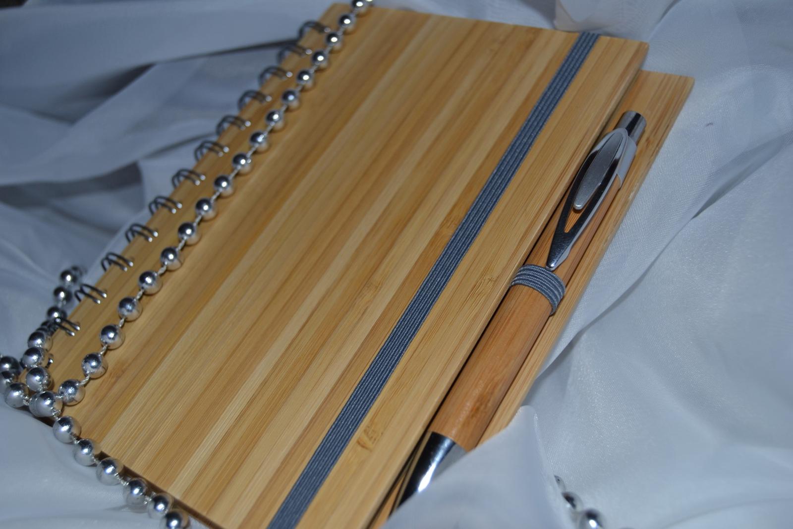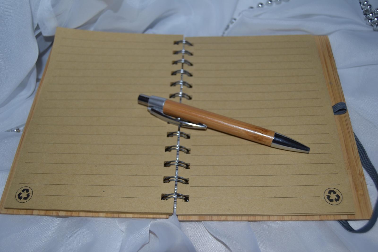 Bambusový zápisník A5 s guličovým perom, šprirálová väzba, 70 recyklovaných linajkových listov. Rozmery: 18 x 14,8 x 1,7 cm, farba hnedá.