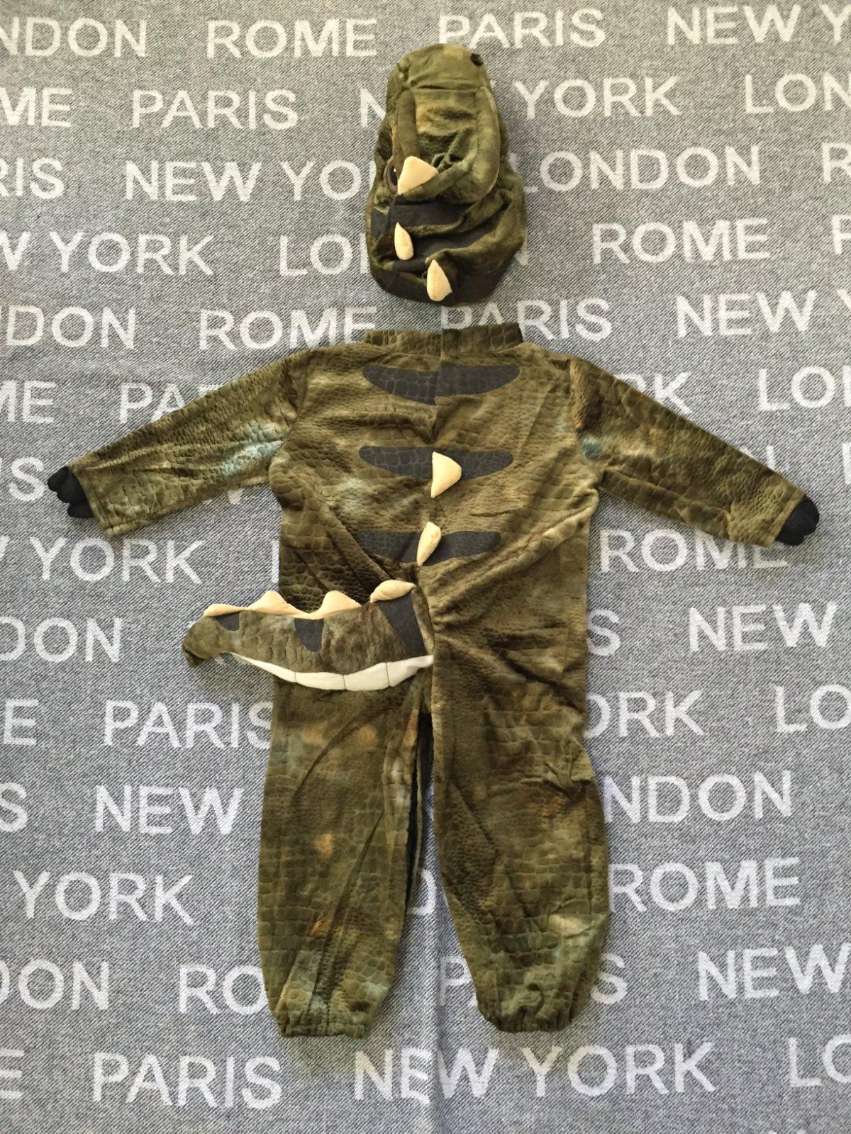 Kostym T-REX raz pouzity, je OK. V rozkroku sa rozopina. Velkost cca 92. Dlzka je 73cm, sirka cez prsia 35cm, rukav 28cm, rozkrok 32cm.. Aj vajce a ponozky.